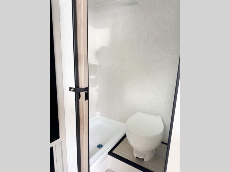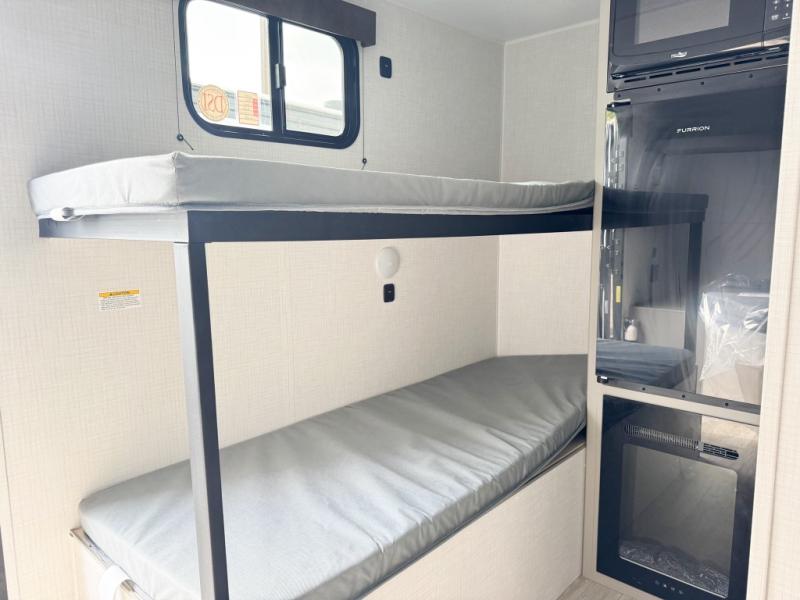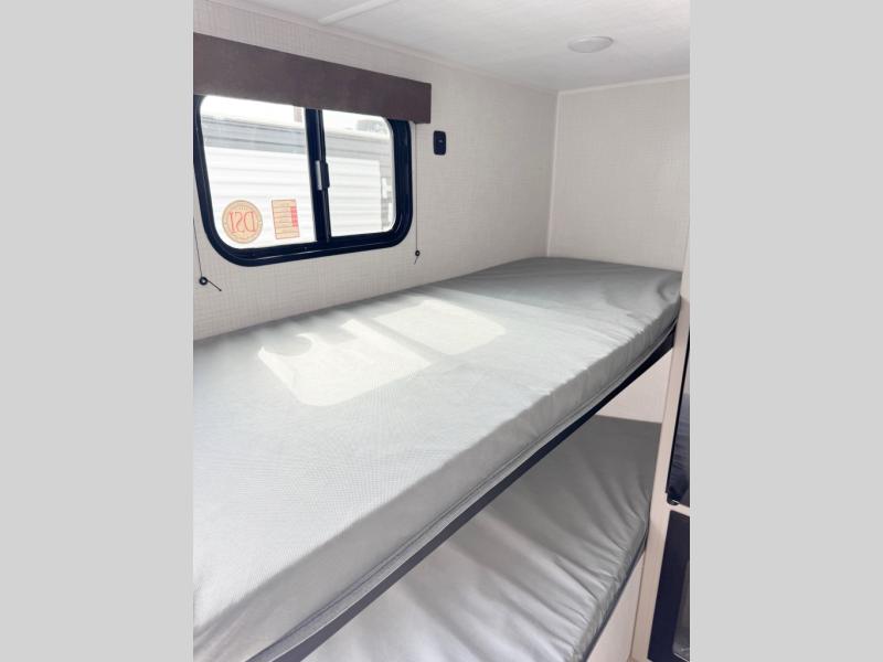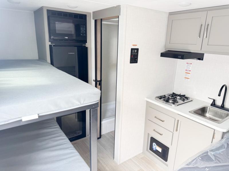 This lightweight travel trailer is perfect for four happy campers. You'll enjoy the front full-size bed, while your guests or little ones take the 28" x 74" bunk beds. There is also a shelf above the bed to keep your things organized. A private bath includes a shower with a toilet so you can freshen up each day without having to leave your camper. You can make your meals on the two burner gas cooktop or in the microwave oven, then take your plate outdoors to eat under the 8' power awning!