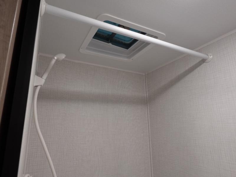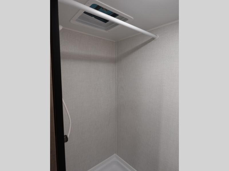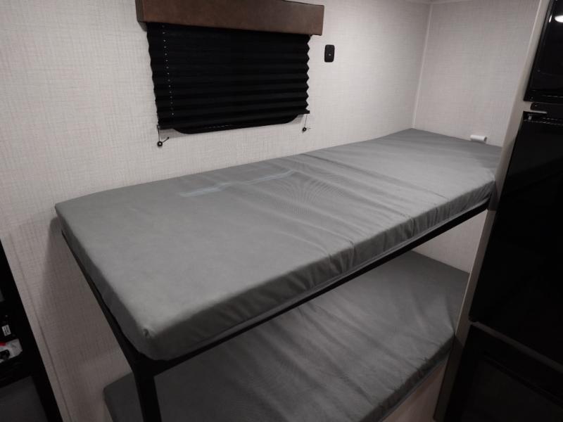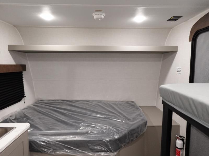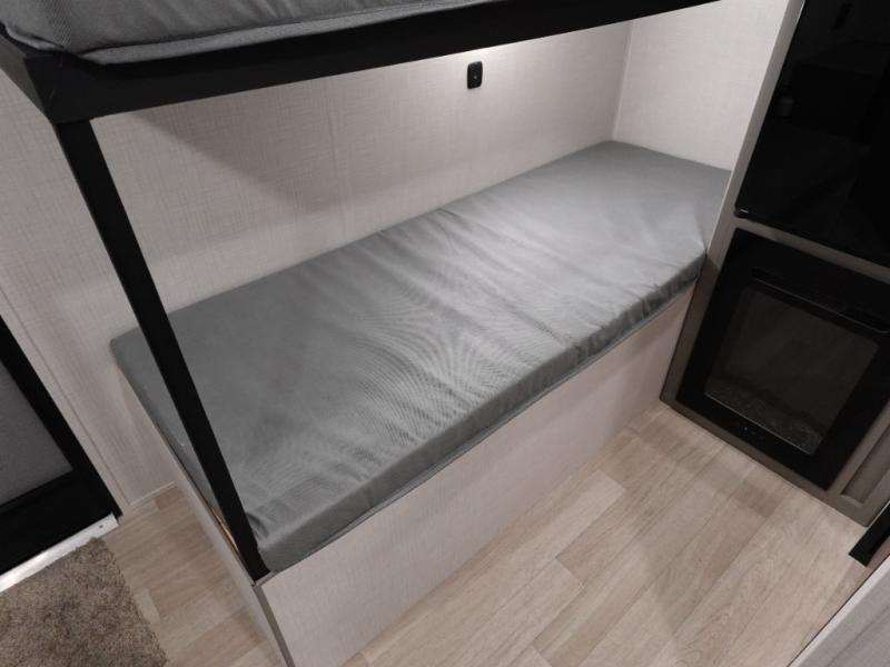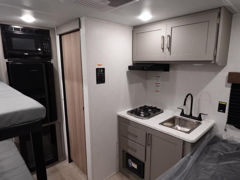 This lightweight travel trailer is perfect for four happy campers. You'll enjoy the front full-size bed, while your guests or little ones take the 28" x 74" bunk beds. There is also a shelf above the bed to keep your things organized. A private bath includes a shower with a toilet so you can freshen up each day without having to leave your camper. You can make your meals on the two burner gas cooktop or in the microwave oven, then take your plate outdoors to eat under the 8' power awning!