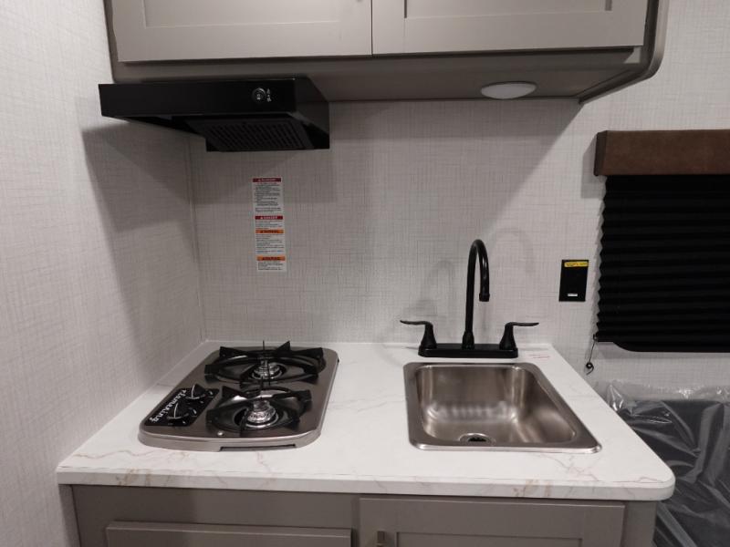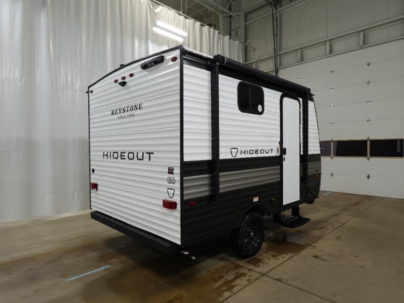 With any Hideout Mini travel trailer by Keystone, you will enjoy lightweight towing thanks to their single-axle! The AlphaPly TPO roof membrane is ultra durable, and the power awning will provide protection from the sun as you relax in your camp chairs outside. Each model includes blackout night shades, LED lighting, plus many more interior comforts. There is also a roof A/C and 20K BTU furnace to keep you comfortable, plus a tankless water heater for endless hot showers!