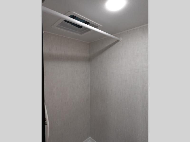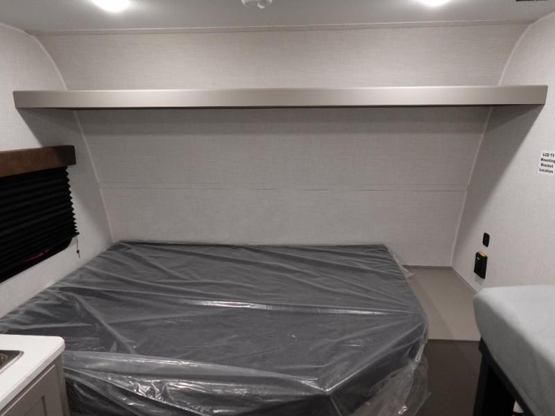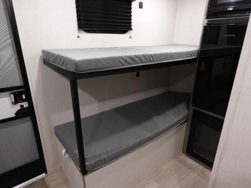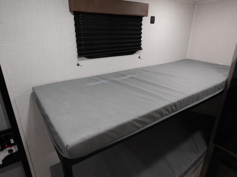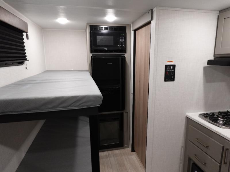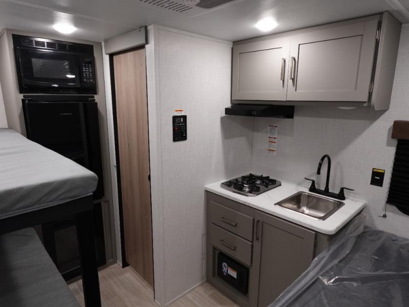 This lightweight travel trailer is perfect for four happy campers. You'll enjoy the front full-size bed, while your guests or little ones take the 28" x 74" bunk beds. There is also a shelf above the bed to keep your things organized. A private bath includes a shower with a toilet so you can freshen up each day without having to leave your camper. You can make your meals on the two burner gas cooktop or in the microwave oven, then take your plate outdoors to eat under the 8' power awning!
