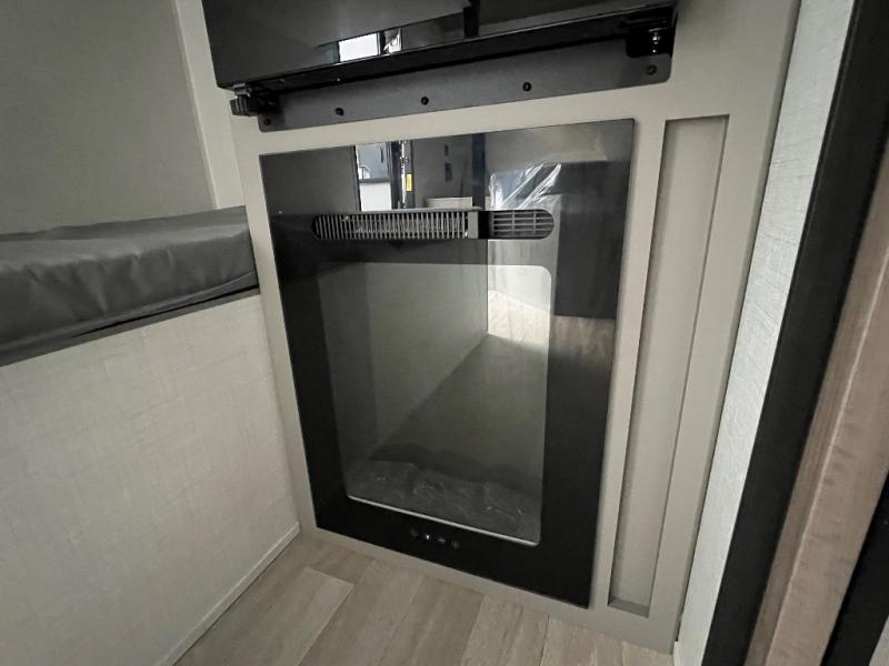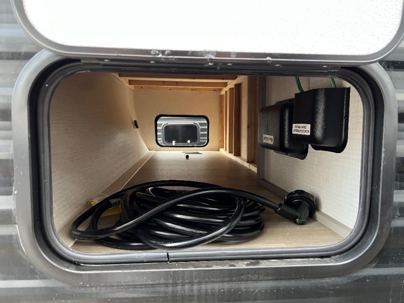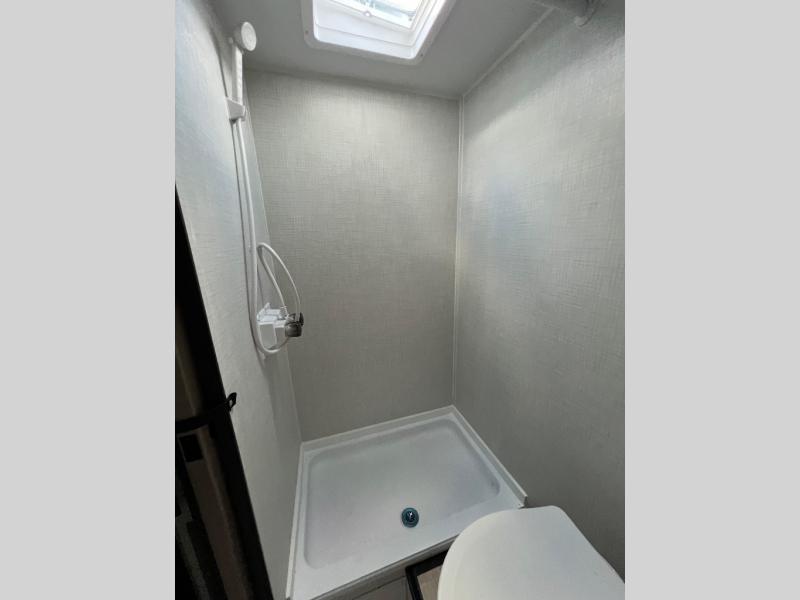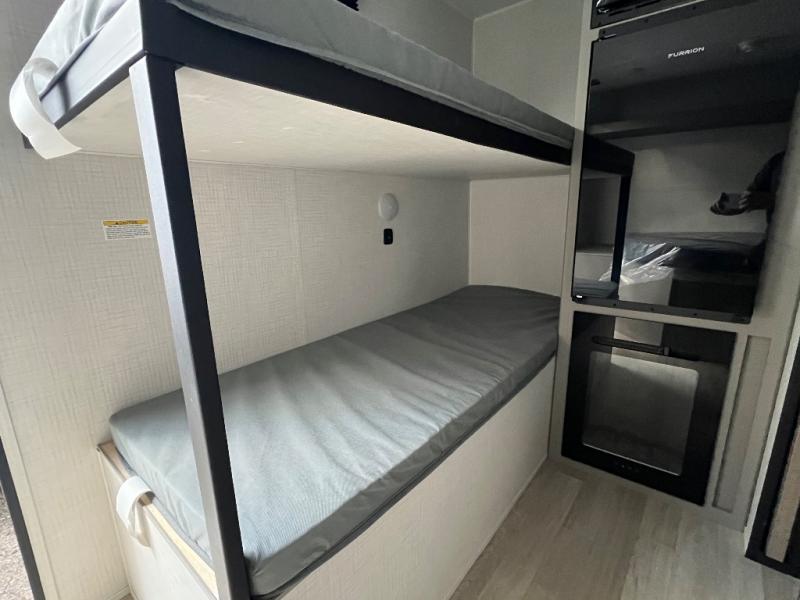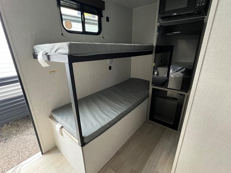 This lightweight travel trailer is perfect for four happy campers. You'll enjoy the front full-size bed, while your guests or little ones take the 28" x 74" bunk beds. There is also a shelf above the bed to keep your things organized. A private bath includes a shower with a toilet so you can freshen up each day without having to leave your camper. You can make your meals on the two burner gas cooktop or in the microwave oven, then take your plate outdoors to eat under the 8' power awning!