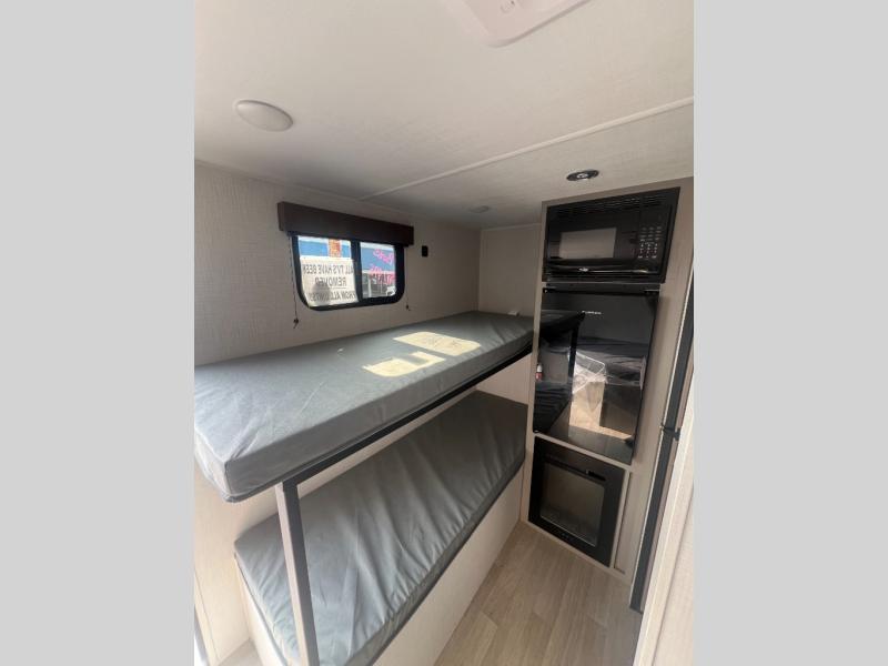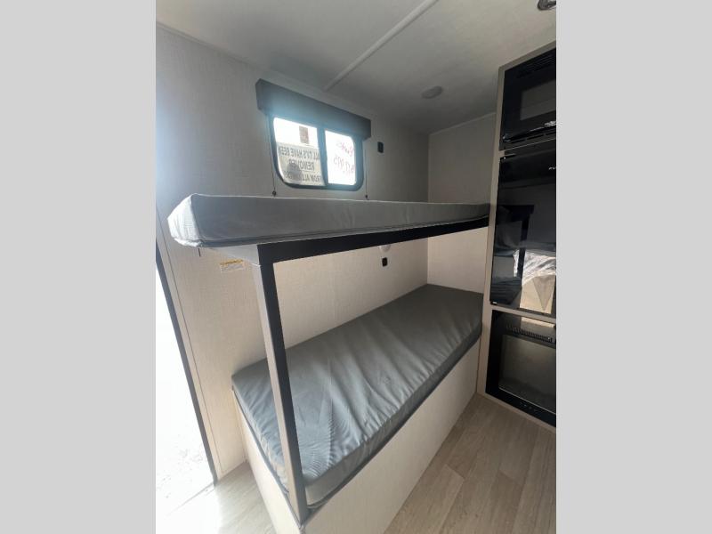 This lightweight travel trailer is perfect for four happy campers. You'll enjoy the front full-size bed, while your guests or little ones take the 28" x 74" bunk beds. There is also a shelf above the bed to keep your things organized. A private bath includes a shower with a toilet so you can freshen up each day without having to leave your camper. You can make your meals on the two burner gas cooktop or in the microwave oven, then take your plate outdoors to eat under the 8' power awning!