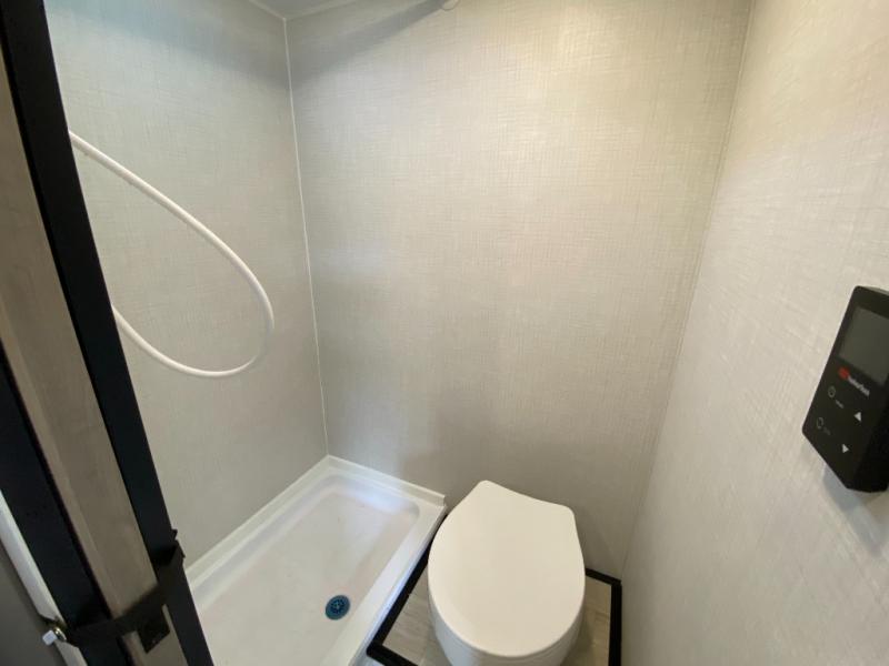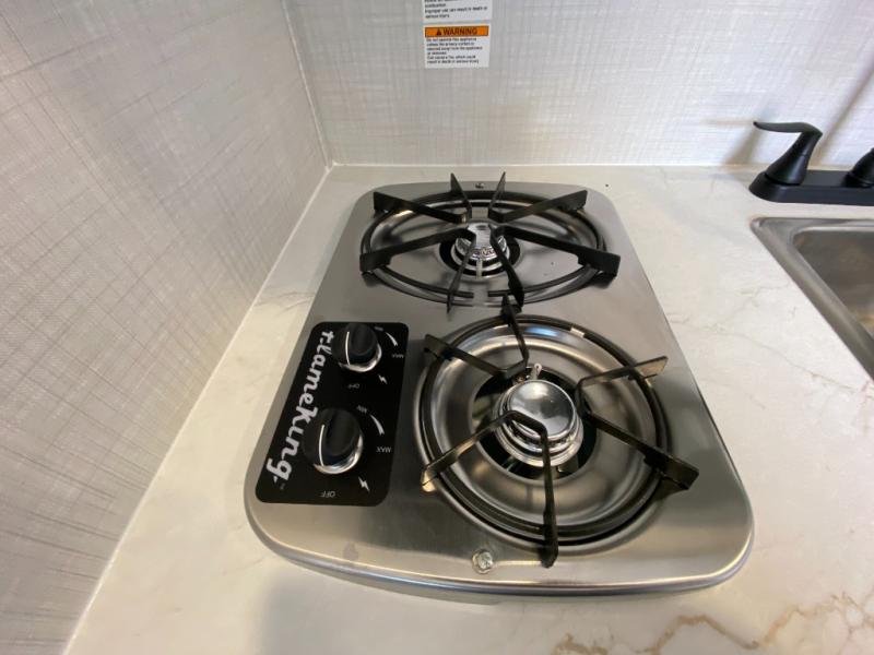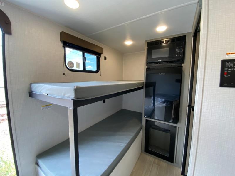 This lightweight travel trailer is perfect for four happy campers. You'll enjoy the front full-size bed, while your guests or little ones take the 28" x 74" bunk beds. There is also a shelf above the bed to keep your things organized. A private bath includes a shower with a toilet so you can freshen up each day without having to leave your camper. You can make your meals on the two burner gas cooktop or in the microwave oven, then take your plate outdoors to eat under the 8' power awning!