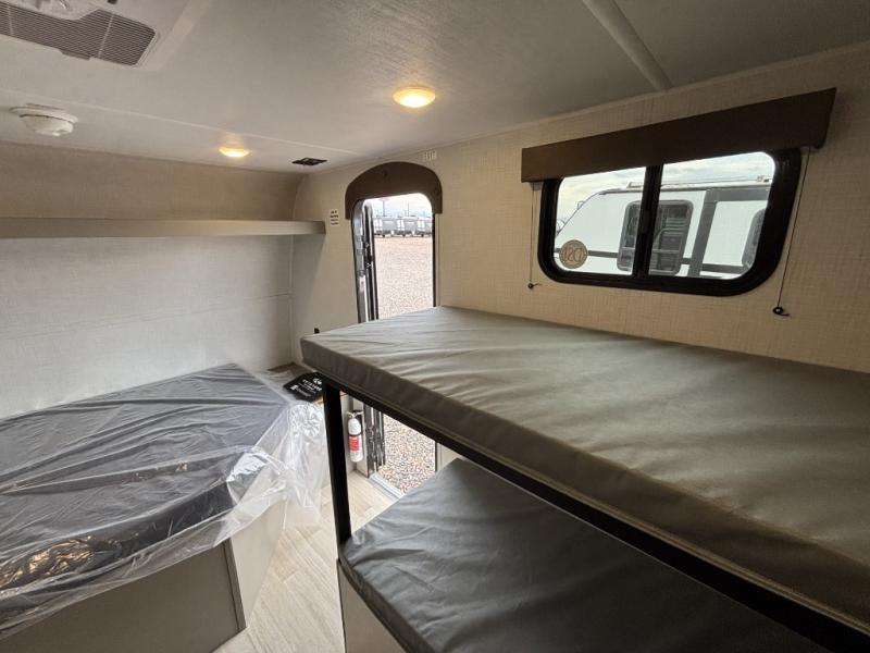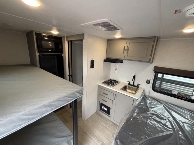 This lightweight travel trailer is perfect for four happy campers. You'll enjoy the front full-size bed, while your guests or little ones take the 28" x 74" bunk beds. There is also a shelf above the bed to keep your things organized. A private bath includes a shower with a toilet so you can freshen up each day without having to leave your camper. You can make your meals on the two burner gas cooktop or in the microwave oven, then take your plate outdoors to eat under the 8' power awning!