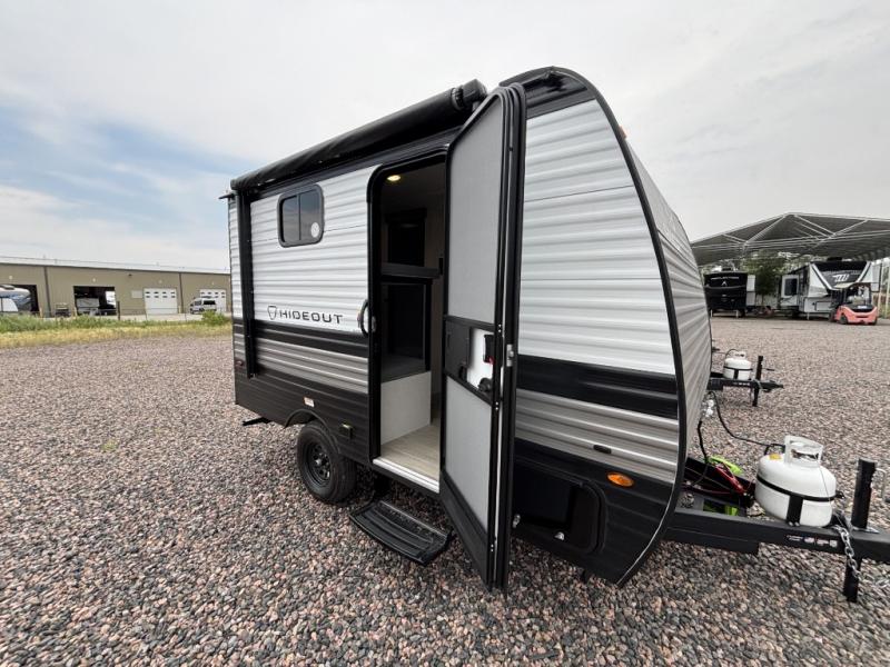 With any Hideout Mini travel trailer by Keystone, you will enjoy lightweight towing thanks to their single-axle! The AlphaPly TPO roof membrane is ultra durable, and the power awning will provide protection from the sun as you relax in your camp chairs outside. Each model includes blackout night shades, LED lighting, plus many more interior comforts. There is also a roof A/C and 20K BTU furnace to keep you comfortable, plus a tankless water heater for endless hot showers!