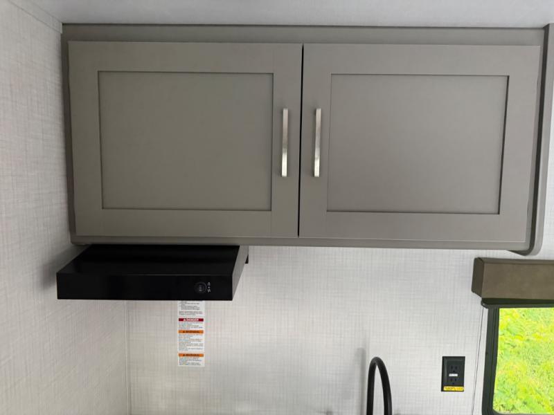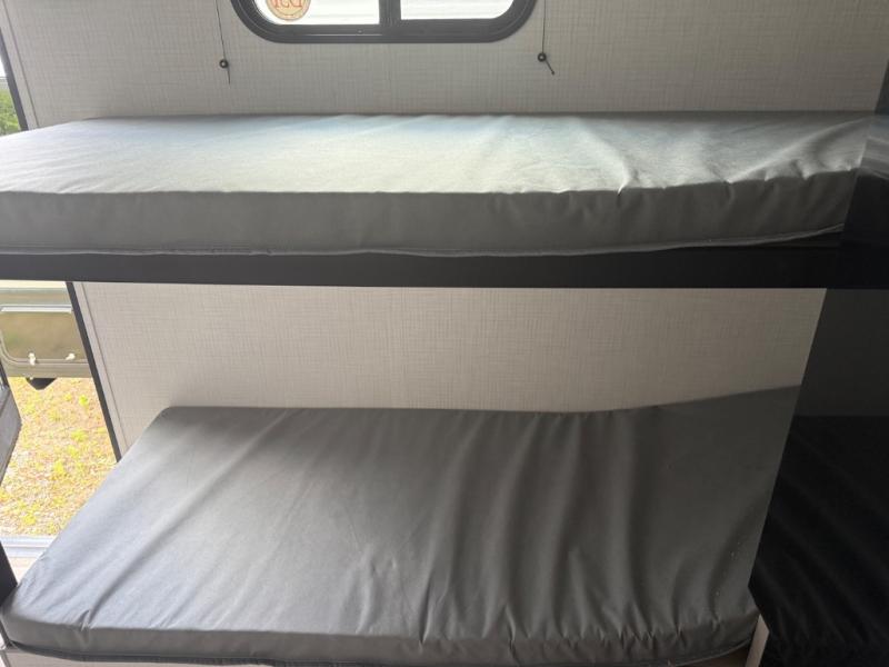 This lightweight travel trailer is perfect for four happy campers. You'll enjoy the front full-size bed, while your guests or little ones take the 28" x 74" bunk beds. There is also a shelf above the bed to keep your things organized. A private bath includes a shower with a toilet so you can freshen up each day without having to leave your camper. You can make your meals on the two burner gas cooktop or in the microwave oven, then take your plate outdoors to eat under the 8' power awning!