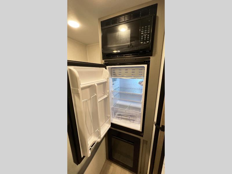 This lightweight travel trailer is perfect for four happy campers. You'll enjoy the front full-size bed, while your guests or little ones take the 28" x 74" bunk beds. There is also a shelf above the bed to keep your things organized. A private bath includes a shower with a toilet so you can freshen up each day without having to leave your camper. You can make your meals on the two burner gas cooktop or in the microwave oven, then take your plate outdoors to eat under the 8' power awning!