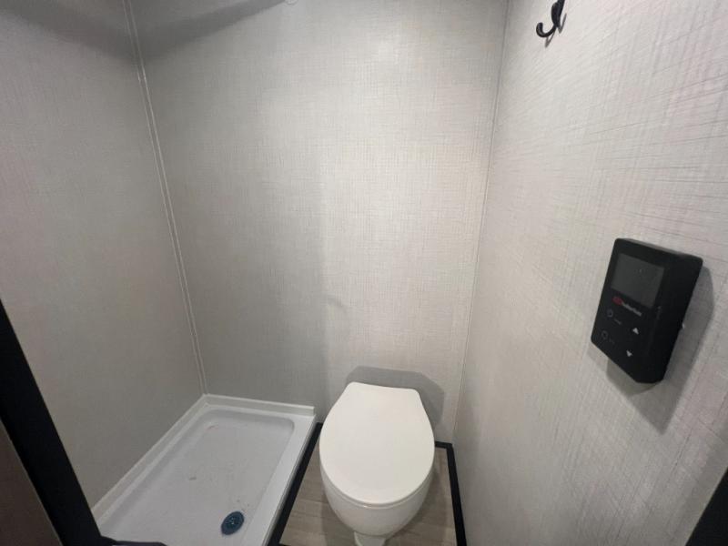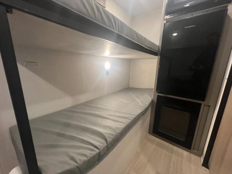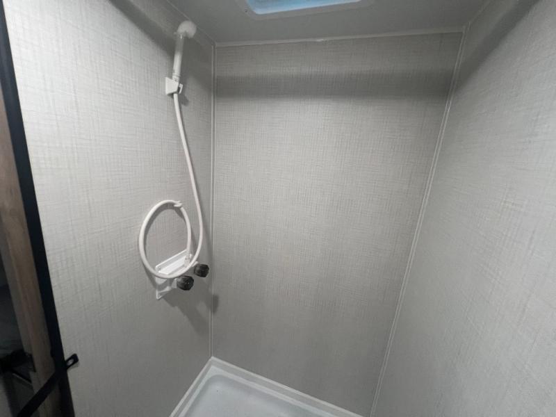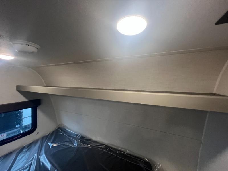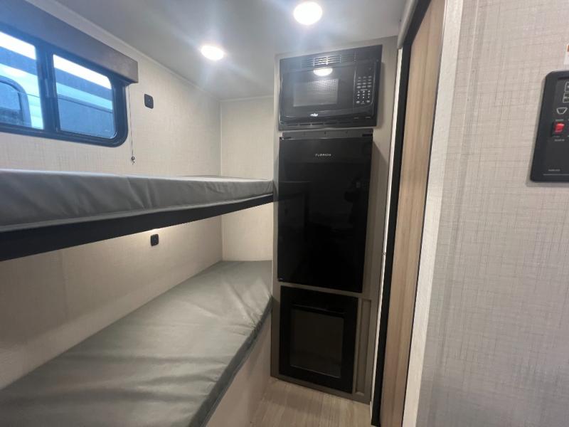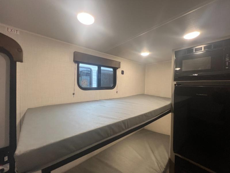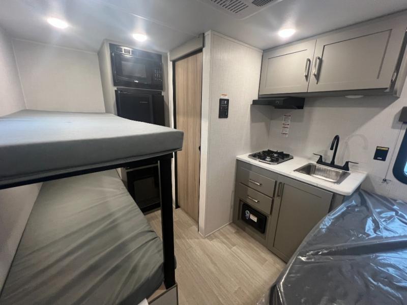 This lightweight travel trailer is perfect for four happy campers. You'll enjoy the front full-size bed, while your guests or little ones take the 28" x 74" bunk beds. There is also a shelf above the bed to keep your things organized. A private bath includes a shower with a toilet so you can freshen up each day without having to leave your camper. You can make your meals on the two burner gas cooktop or in the microwave oven, then take your plate outdoors to eat under the 8' power awning!