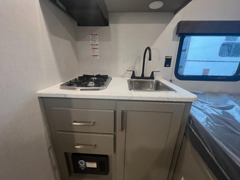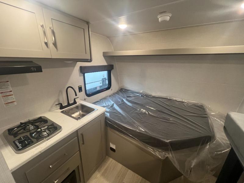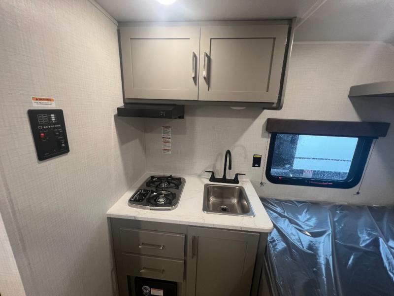 With any Hideout Mini travel trailer by Keystone, you will enjoy lightweight towing thanks to their single-axle! The AlphaPly TPO roof membrane is ultra durable, and the power awning will provide protection from the sun as you relax in your camp chairs outside. Each model includes blackout night shades, LED lighting, plus many more interior comforts. There is also a roof A/C and 20K BTU furnace to keep you comfortable, plus a tankless water heater for endless hot showers!