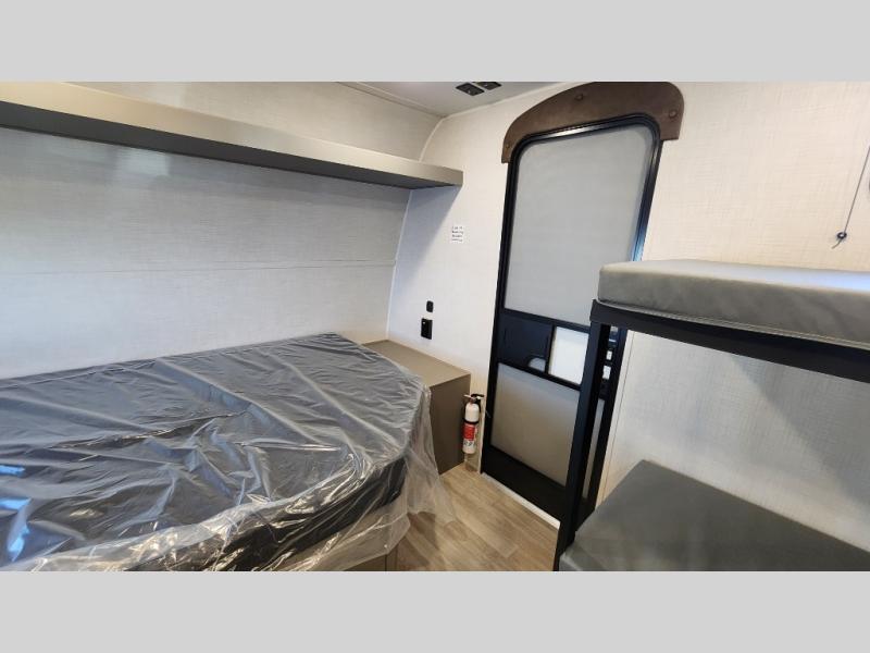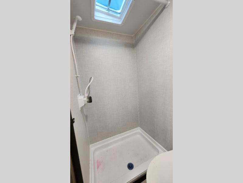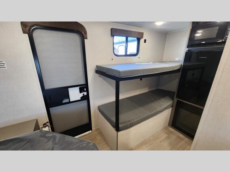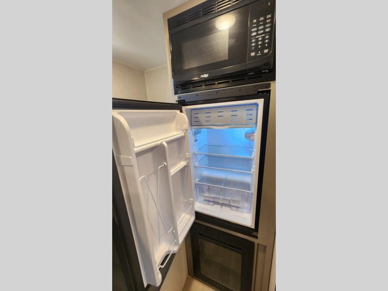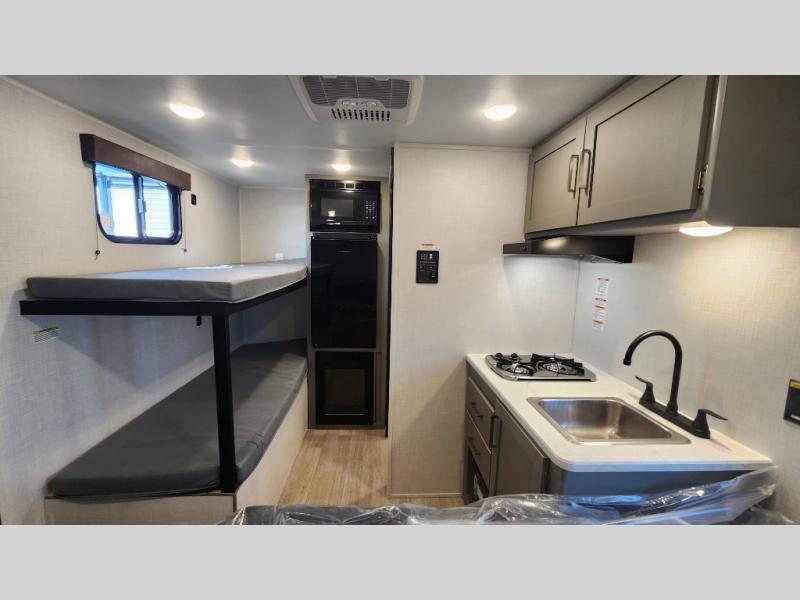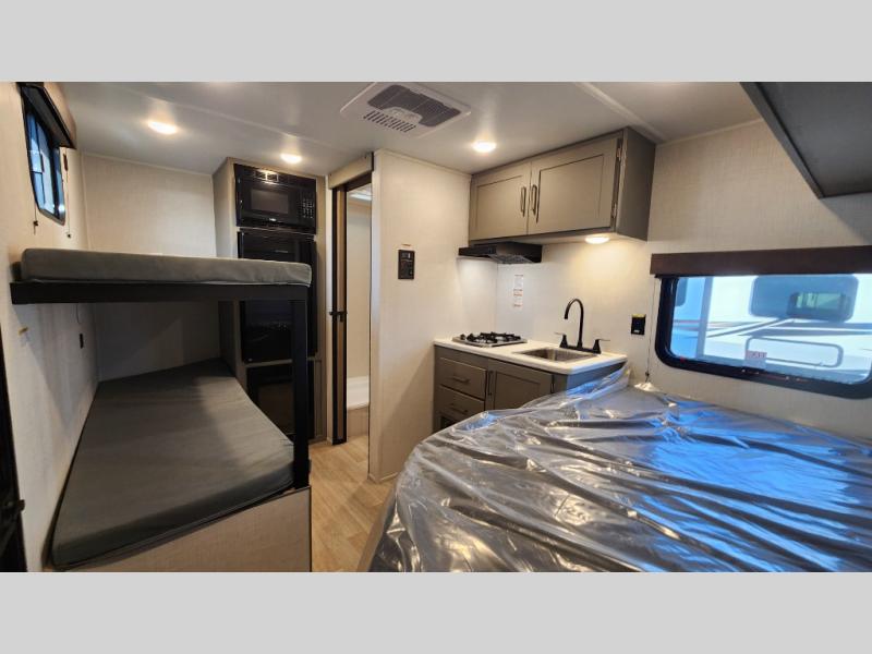 This lightweight travel trailer is perfect for four happy campers. You'll enjoy the front full-size bed, while your guests or little ones take the 28" x 74" bunk beds. There is also a shelf above the bed to keep your things organized. A private bath includes a shower with a toilet so you can freshen up each day without having to leave your camper. You can make your meals on the two burner gas cooktop or in the microwave oven, then take your plate outdoors to eat under the 8' power awning!