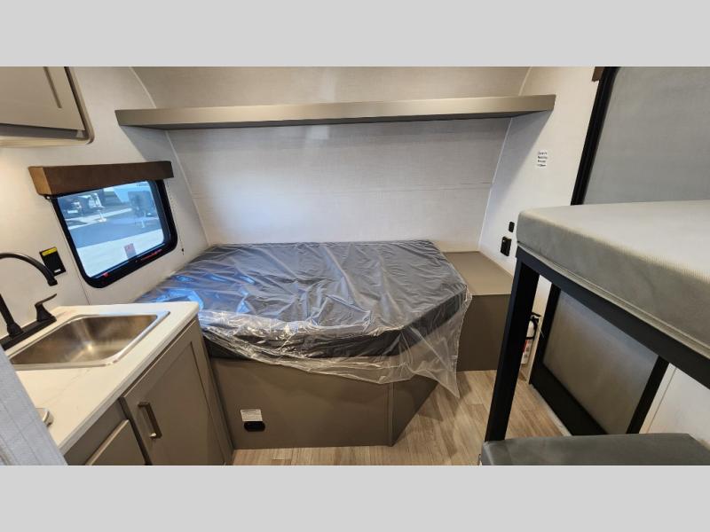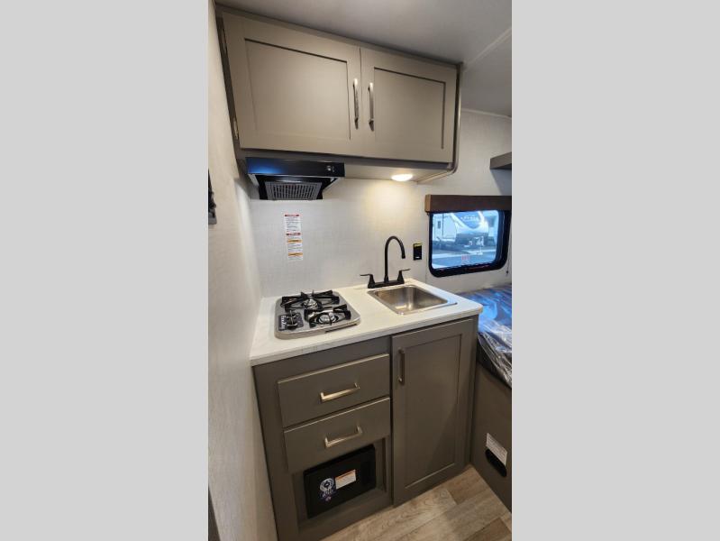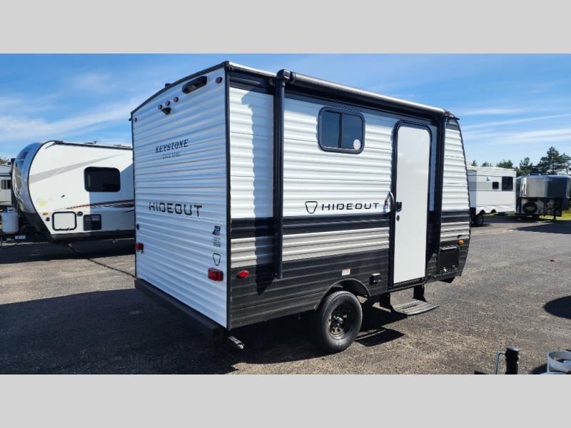 With any Hideout Mini travel trailer by Keystone, you will enjoy lightweight towing thanks to their single-axle! The AlphaPly TPO roof membrane is ultra durable, and the power awning will provide protection from the sun as you relax in your camp chairs outside. Each model includes blackout night shades, LED lighting, plus many more interior comforts. There is also a roof A/C and 20K BTU furnace to keep you comfortable, plus a tankless water heater for endless hot showers!
