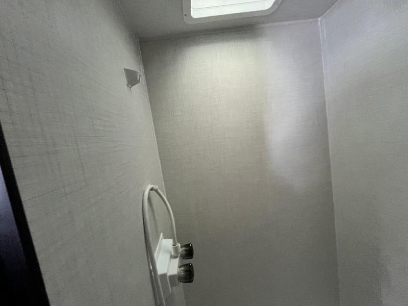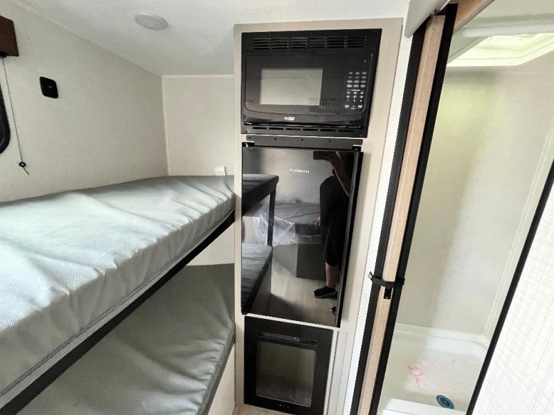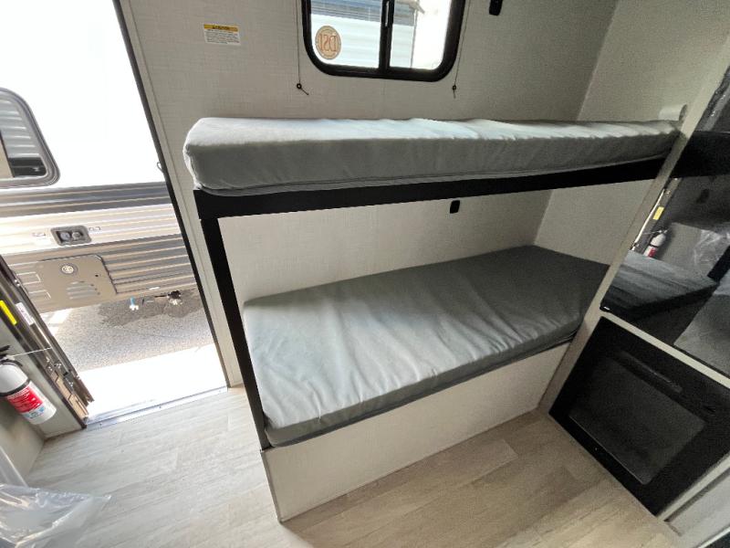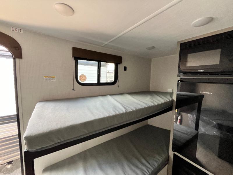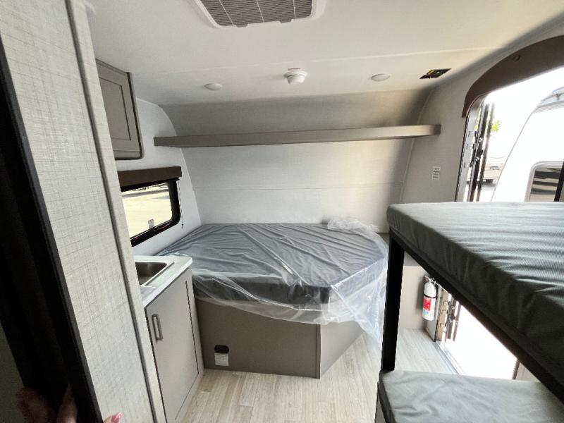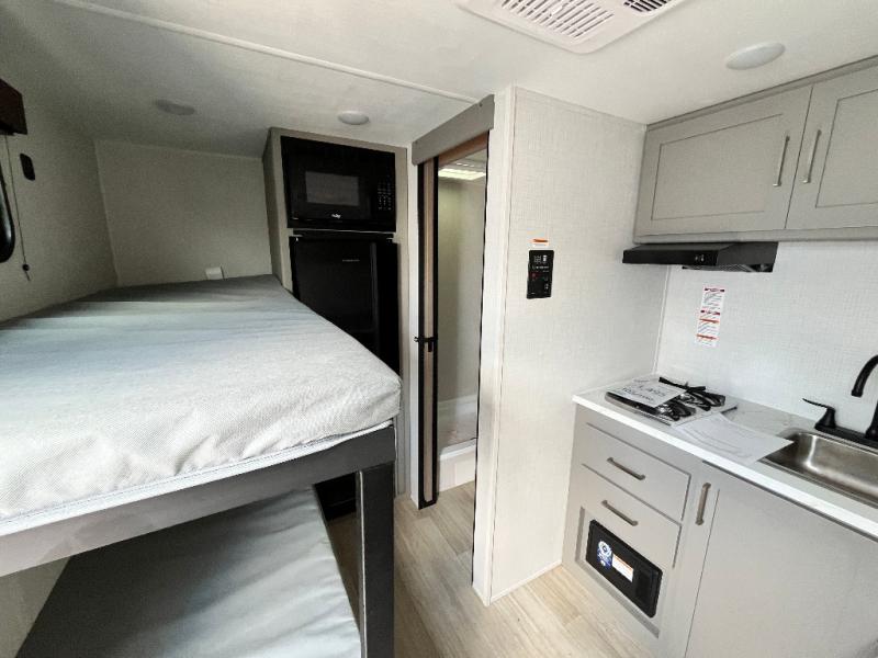 This lightweight travel trailer is perfect for four happy campers. You'll enjoy the front full-size bed, while your guests or little ones take the 28" x 74" bunk beds. There is also a shelf above the bed to keep your things organized. A private bath includes a shower with a toilet so you can freshen up each day without having to leave your camper. You can make your meals on the two burner gas cooktop or in the microwave oven, then take your plate outdoors to eat under the 8' power awning!