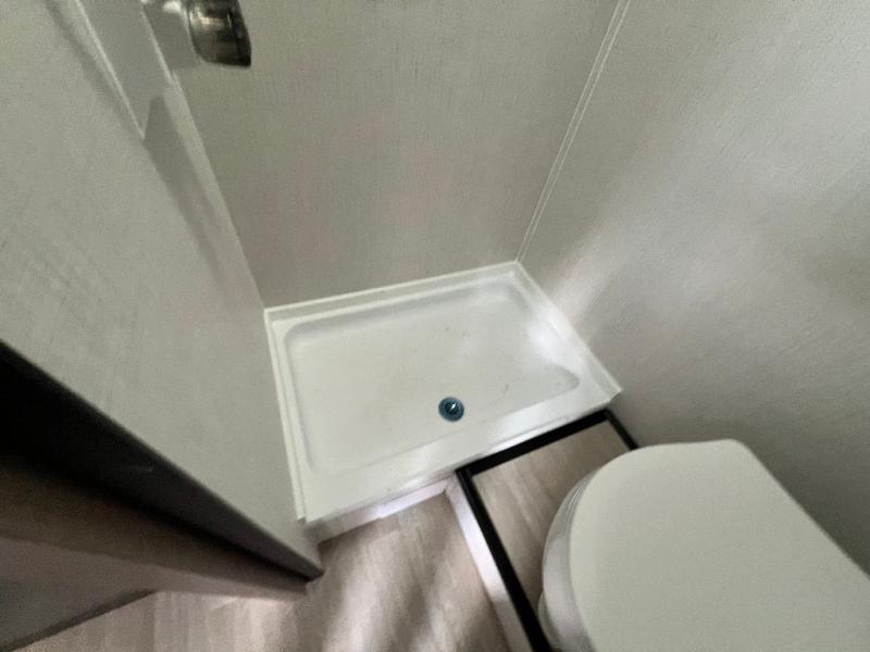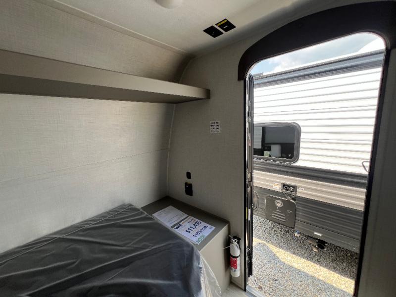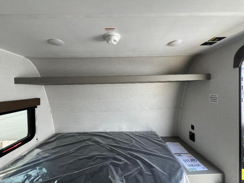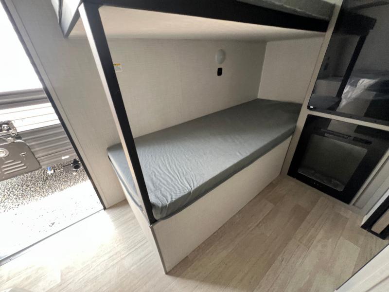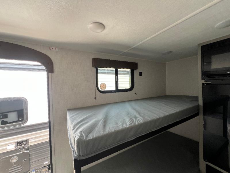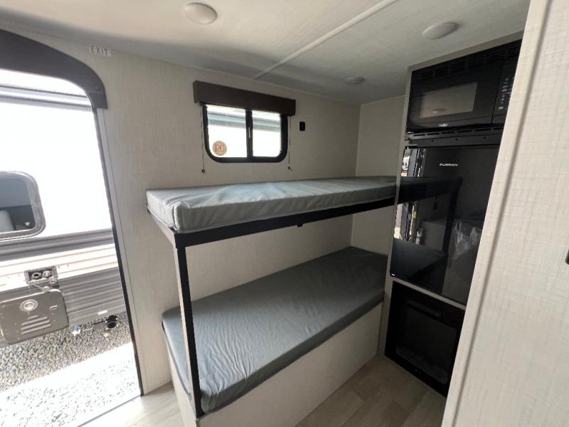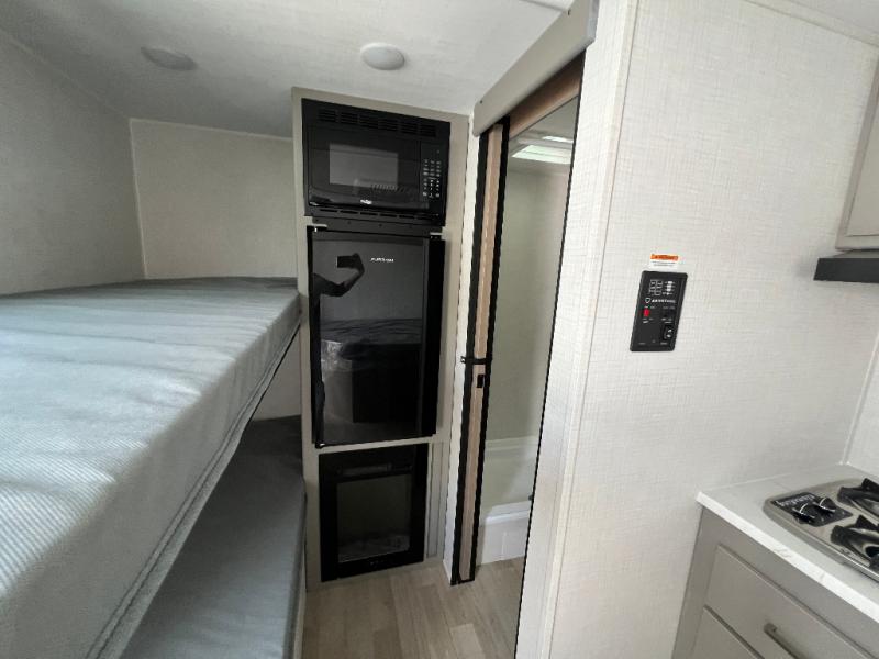 This lightweight travel trailer is perfect for four happy campers. You'll enjoy the front full-size bed, while your guests or little ones take the 28" x 74" bunk beds. There is also a shelf above the bed to keep your things organized. A private bath includes a shower with a toilet so you can freshen up each day without having to leave your camper. You can make your meals on the two burner gas cooktop or in the microwave oven, then take your plate outdoors to eat under the 8' power awning!
