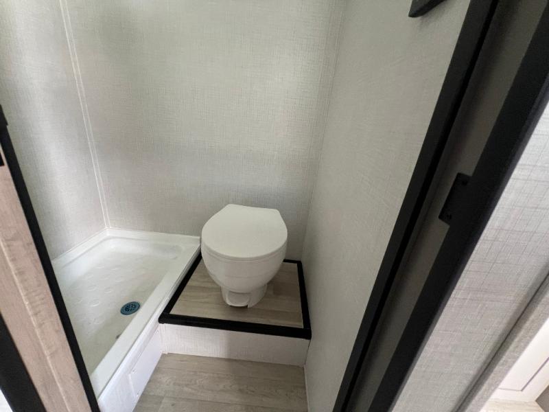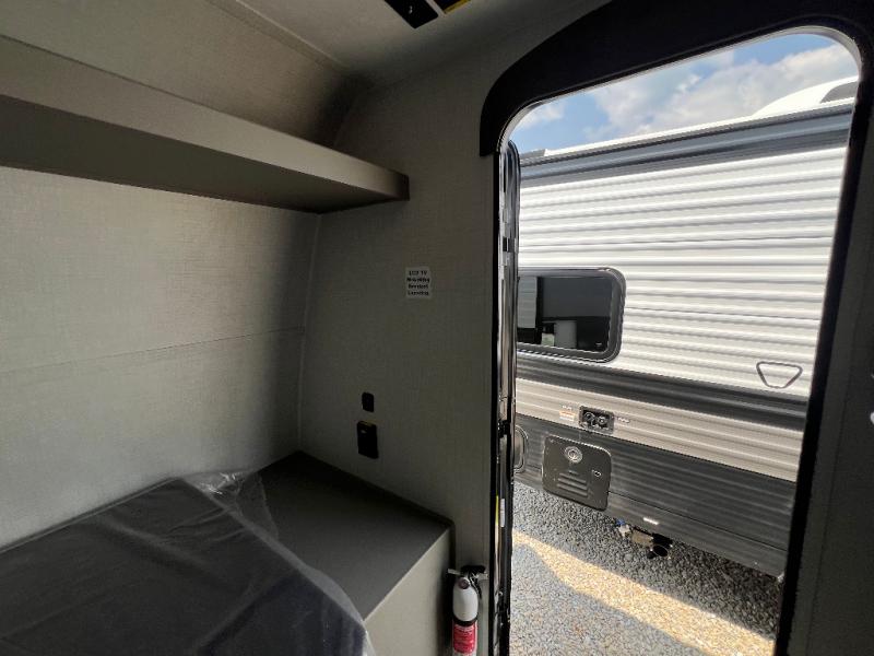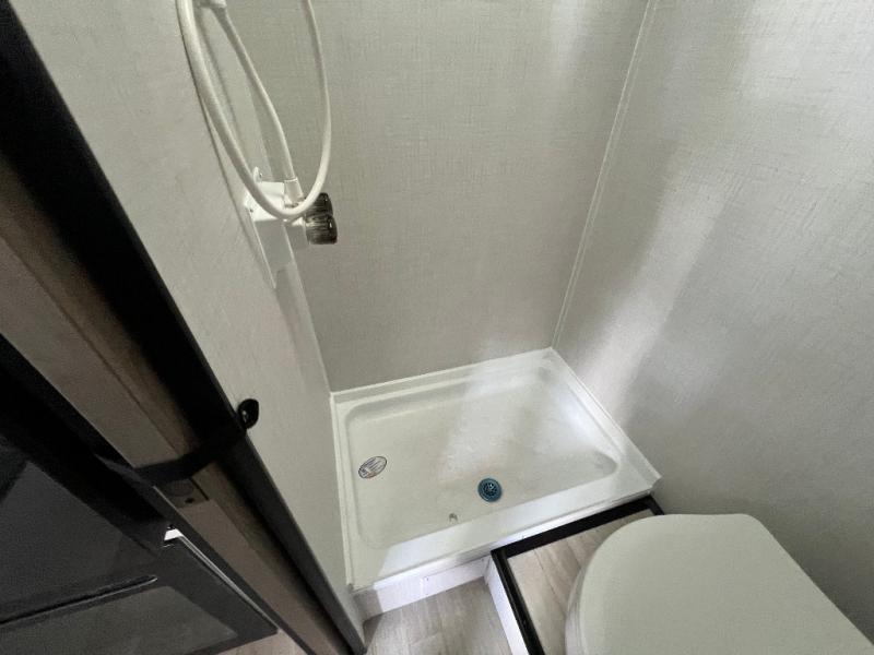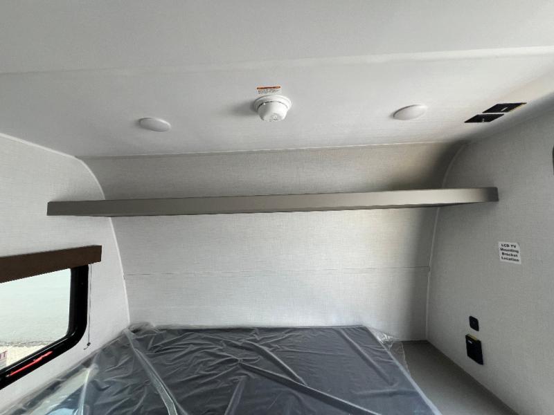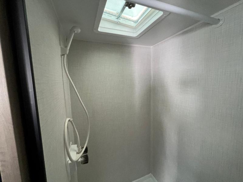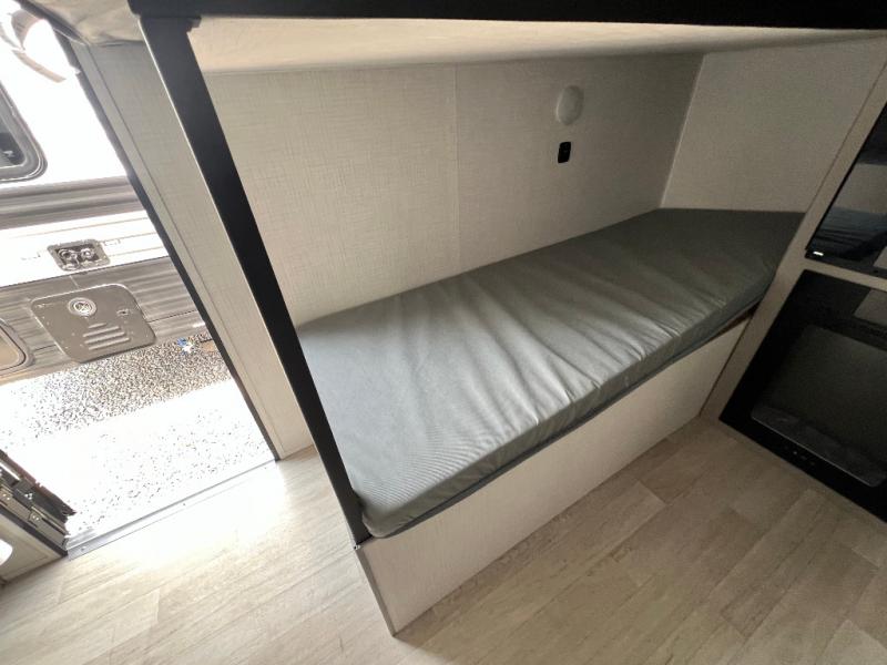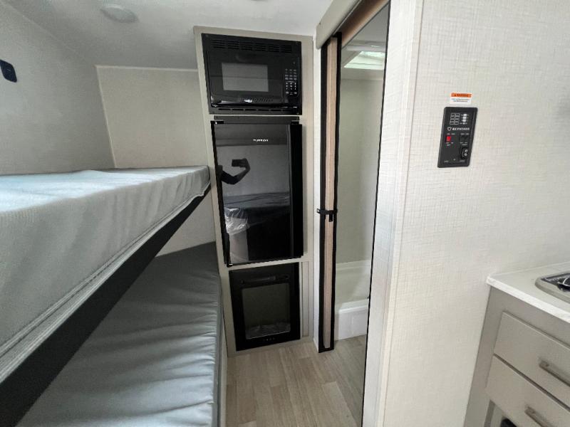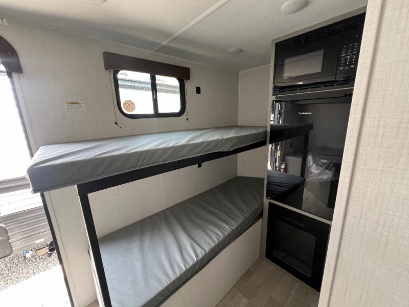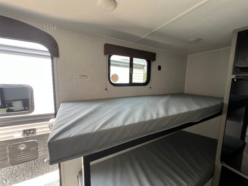 This lightweight travel trailer is perfect for four happy campers. You'll enjoy the front full-size bed, while your guests or little ones take the 28" x 74" bunk beds. There is also a shelf above the bed to keep your things organized. A private bath includes a shower with a toilet so you can freshen up each day without having to leave your camper. You can make your meals on the two burner gas cooktop or in the microwave oven, then take your plate outdoors to eat under the 8' power awning!