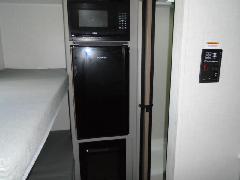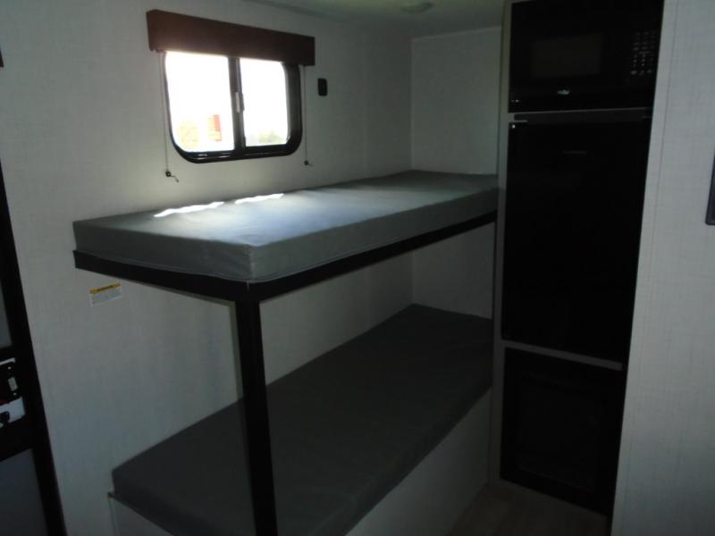 This lightweight travel trailer is perfect for four happy campers. You'll enjoy the front full-size bed, while your guests or little ones take the 28" x 74" bunk beds. There is also a shelf above the bed to keep your things organized. A private bath includes a shower with a toilet so you can freshen up each day without having to leave your camper. You can make your meals on the two burner gas cooktop or in the microwave oven, then take your plate outdoors to eat under the 8' power awning!