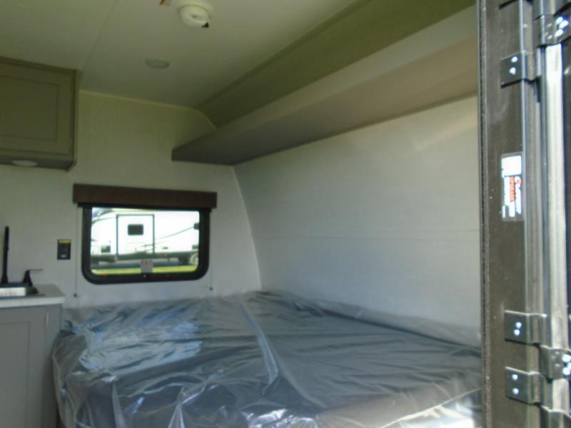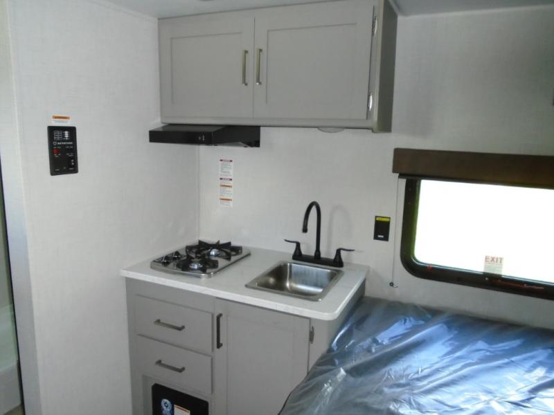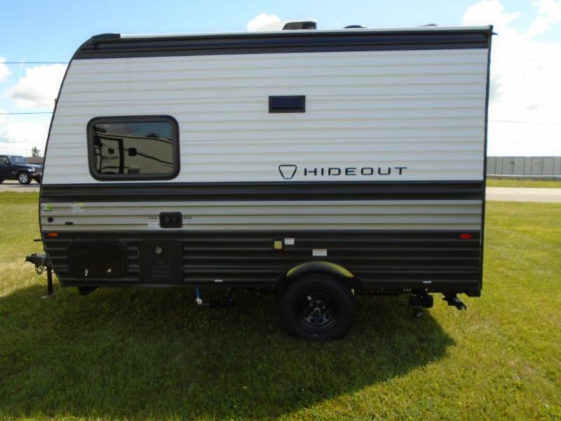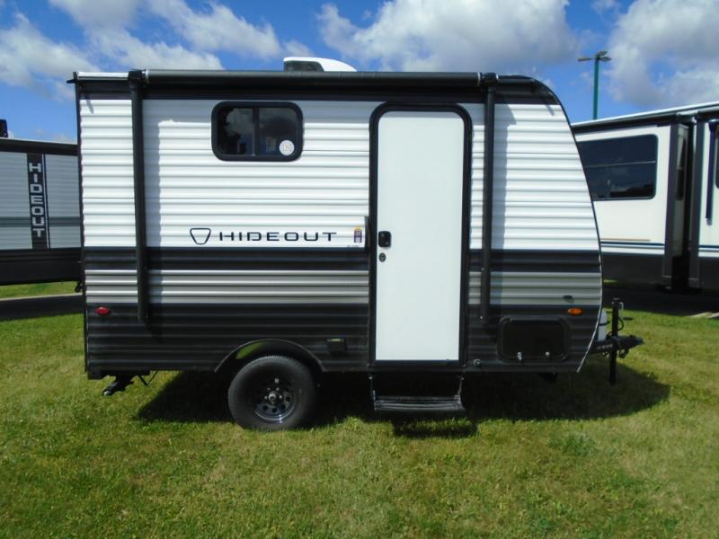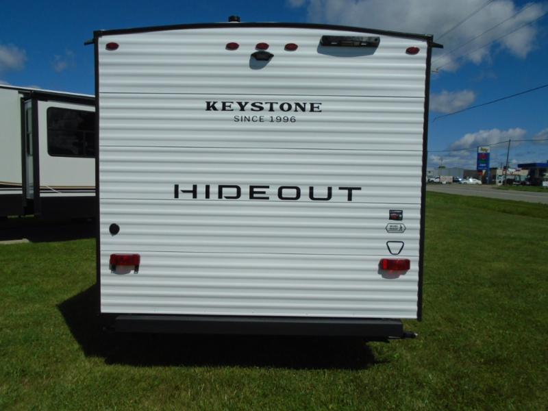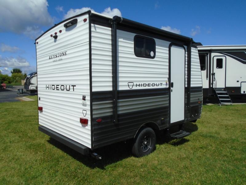 With any Hideout Mini travel trailer by Keystone, you will enjoy lightweight towing thanks to their single-axle! The AlphaPly TPO roof membrane is ultra durable, and the power awning will provide protection from the sun as you relax in your camp chairs outside. Each model includes blackout night shades, LED lighting, plus many more interior comforts. There is also a roof A/C and 20K BTU furnace to keep you comfortable, plus a tankless water heater for endless hot showers!