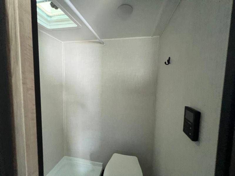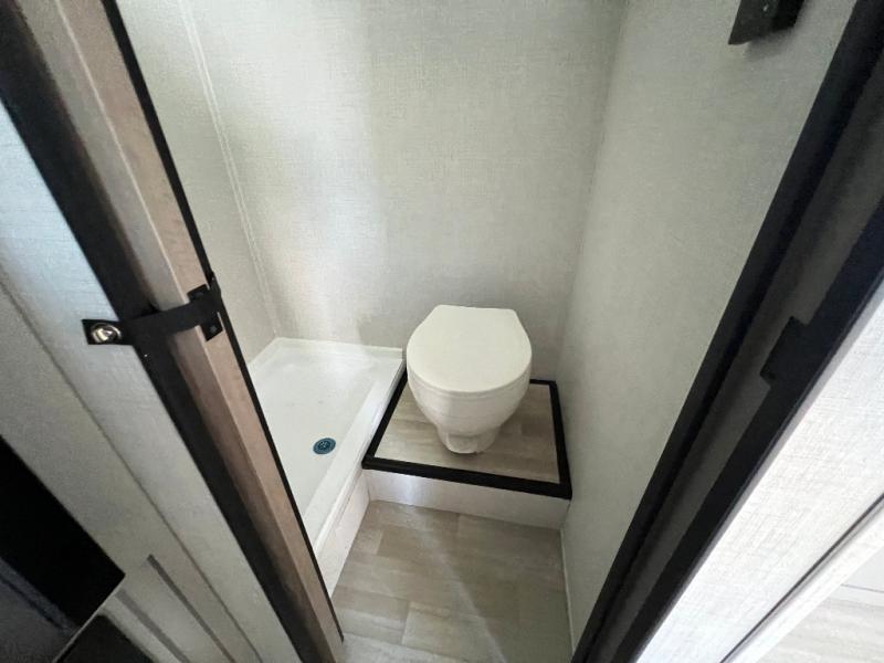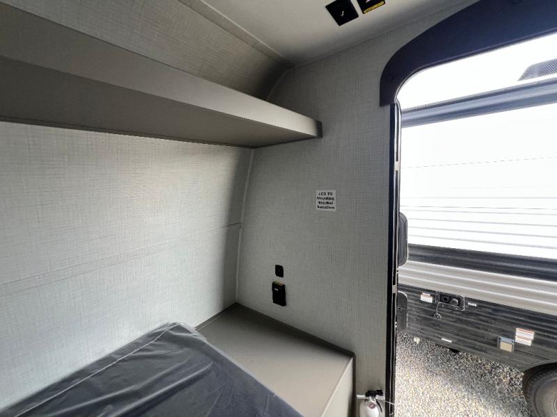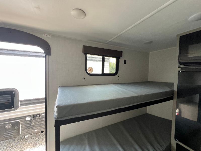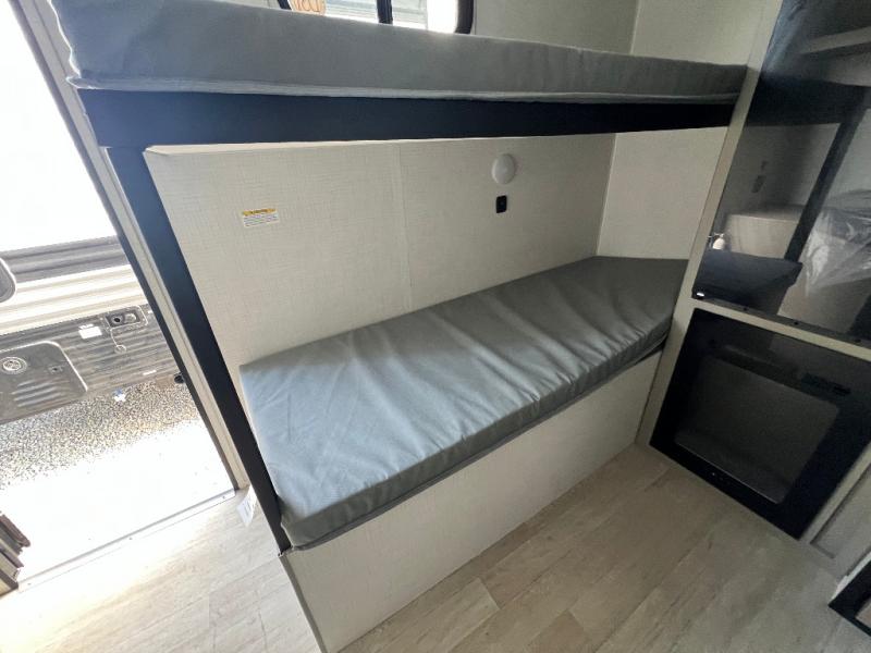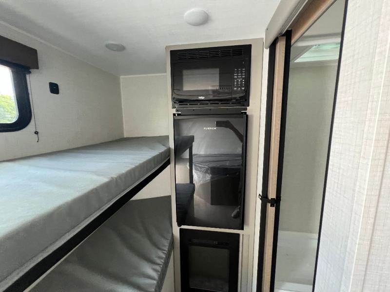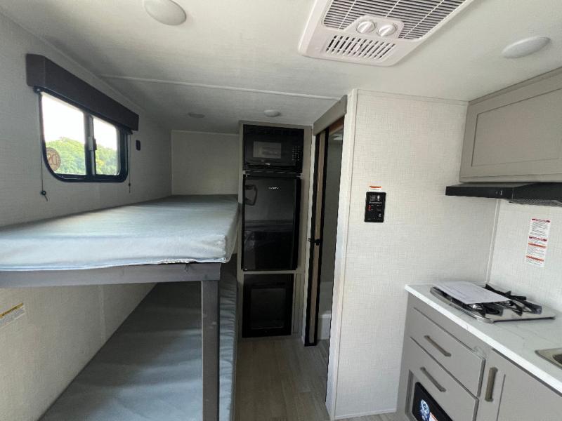This lightweight travel trailer is perfect for four happy campers. You'll enjoy the front full-size bed, while your guests or little ones take the 28" x 74" bunk beds. There is also a shelf above the bed to keep your things organized. A private bath includes a shower with a toilet so you can freshen up each day without having to leave your camper. You can make your meals on the two burner gas cooktop or in the microwave oven, then take your plate outdoors to eat under the 8' power awning!