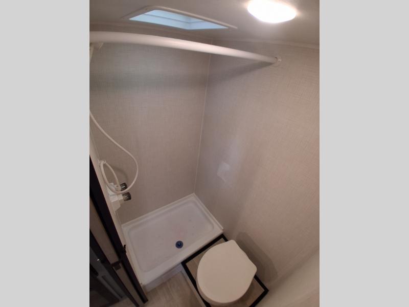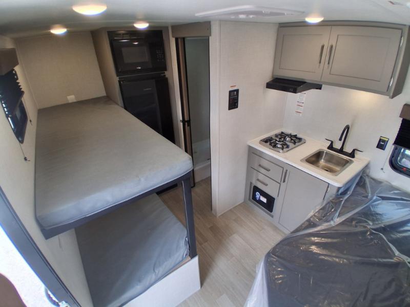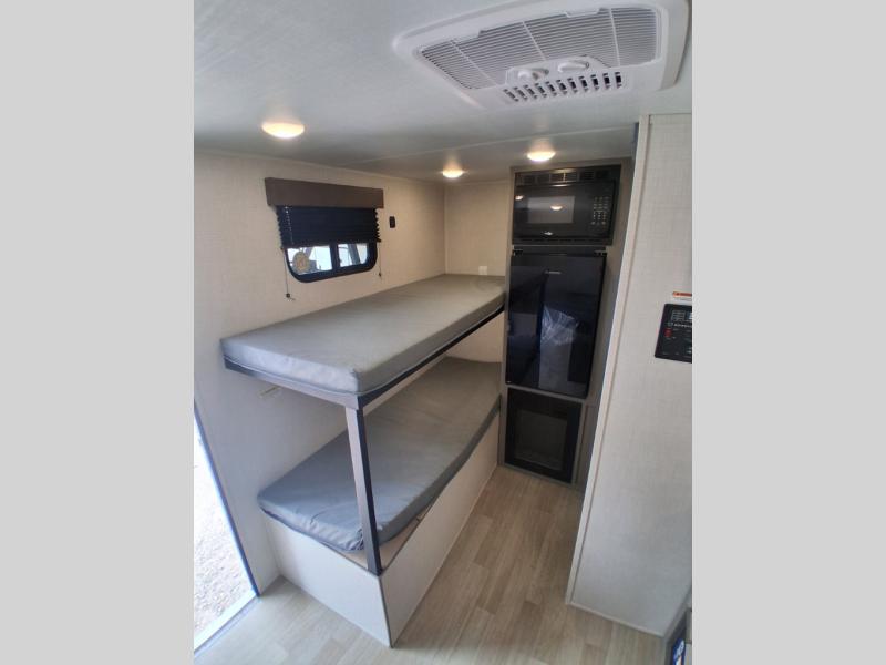 This lightweight travel trailer is perfect for four happy campers. You'll enjoy the front full-size bed, while your guests or little ones take the 28" x 74" bunk beds. There is also a shelf above the bed to keep your things organized. A private bath includes a shower with a toilet so you can freshen up each day without having to leave your camper. You can make your meals on the two burner gas cooktop or in the microwave oven, then take your plate outdoors to eat under the 8' power awning!