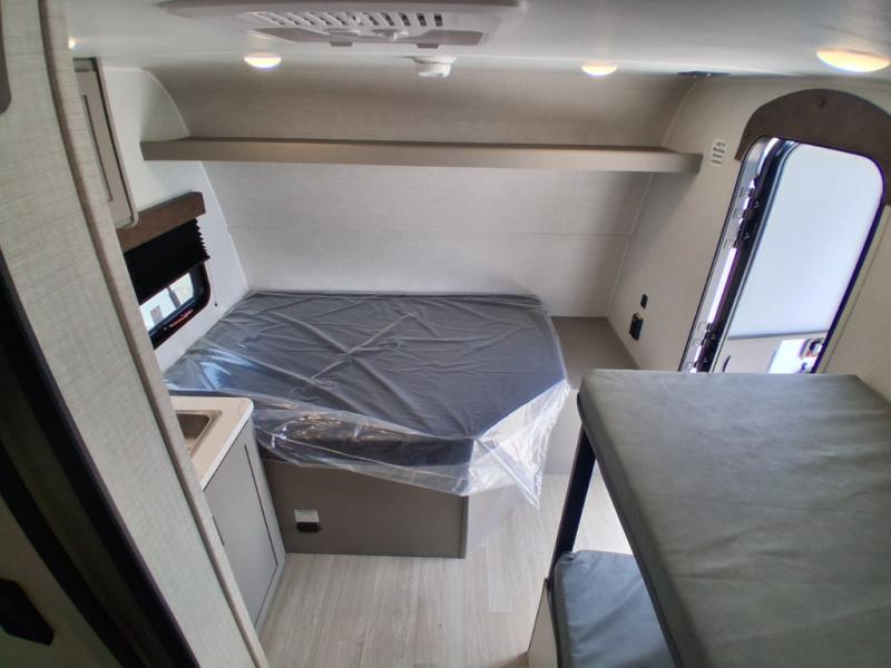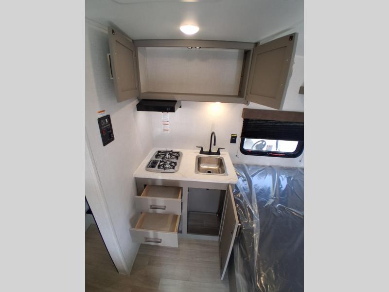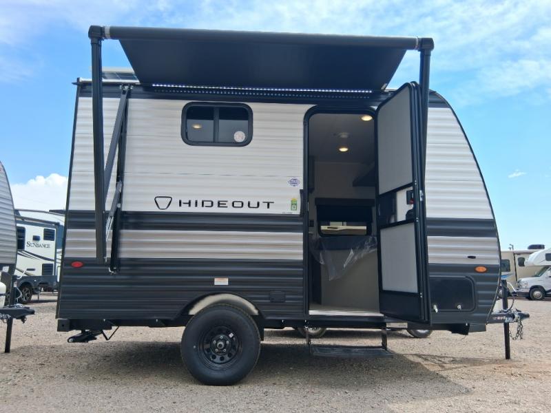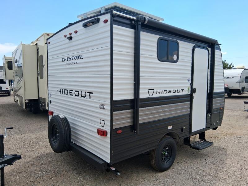 With any Hideout Mini travel trailer by Keystone, you will enjoy lightweight towing thanks to their single-axle! The AlphaPly TPO roof membrane is ultra durable, and the power awning will provide protection from the sun as you relax in your camp chairs outside. Each model includes blackout night shades, LED lighting, plus many more interior comforts. There is also a roof A/C and 20K BTU furnace to keep you comfortable, plus a tankless water heater for endless hot showers!