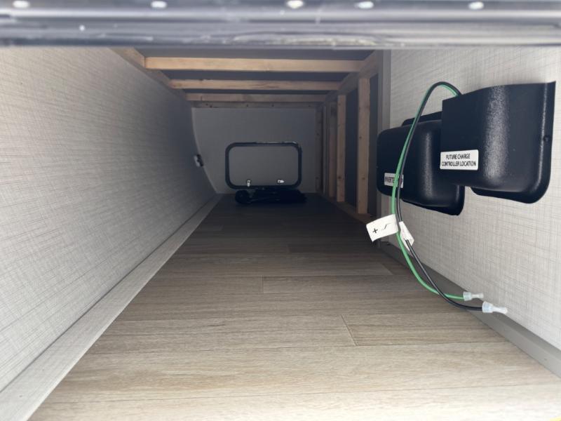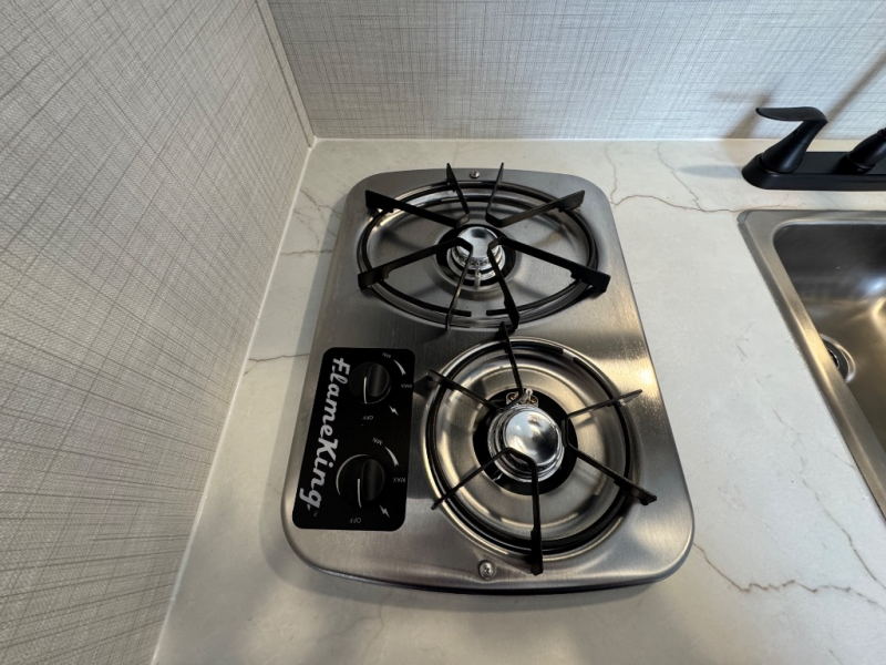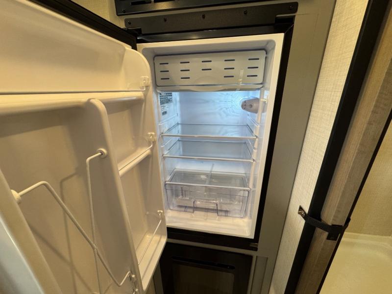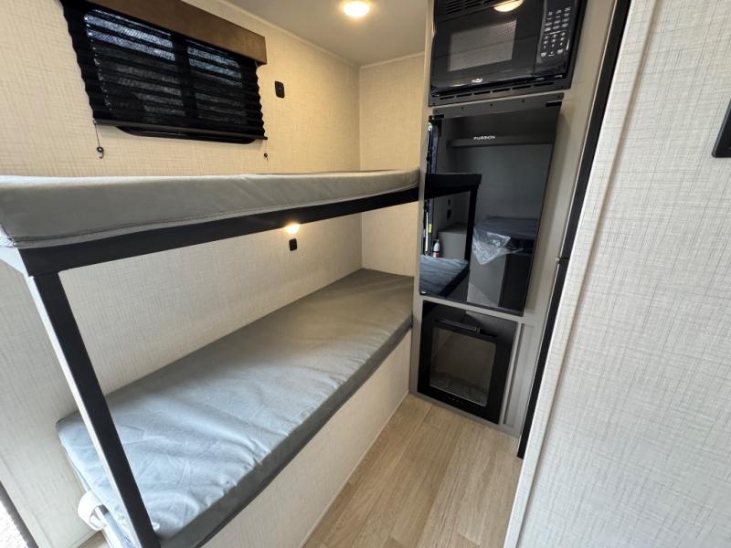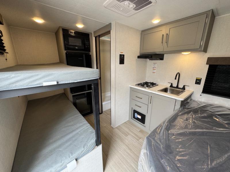 This lightweight travel trailer is perfect for four happy campers. You'll enjoy the front full-size bed, while your guests or little ones take the 28" x 74" bunk beds. There is also a shelf above the bed to keep your things organized. A private bath includes a shower with a toilet so you can freshen up each day without having to leave your camper. You can make your meals on the two burner gas cooktop or in the microwave oven, then take your plate outdoors to eat under the 8' power awning!