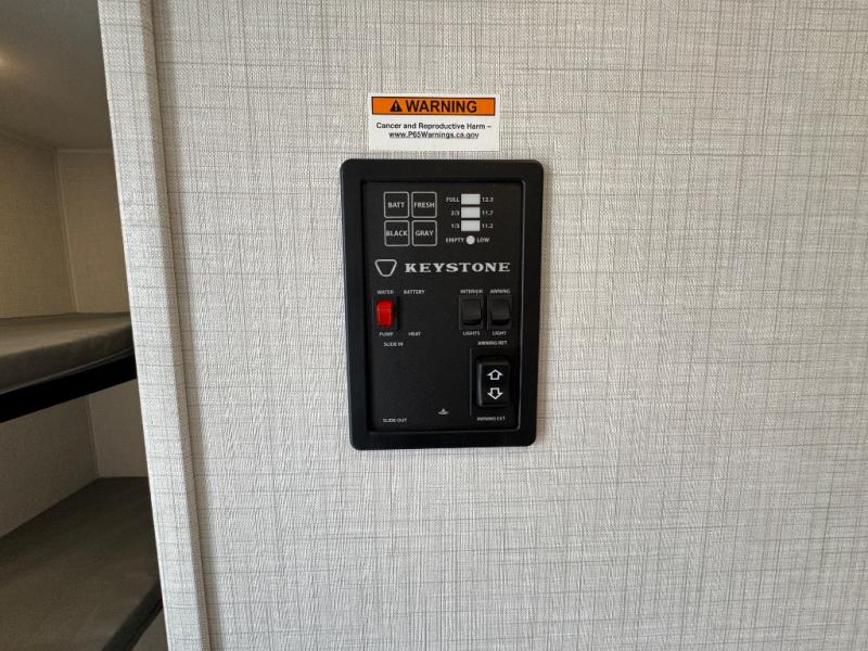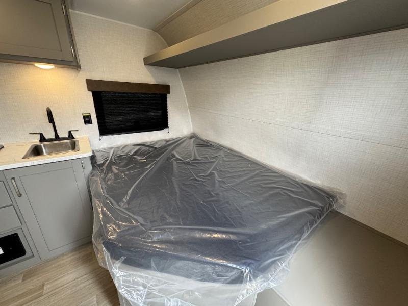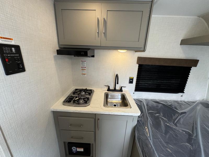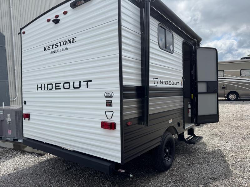 With any Hideout Mini travel trailer by Keystone, you will enjoy lightweight towing thanks to their single-axle! The AlphaPly TPO roof membrane is ultra durable, and the power awning will provide protection from the sun as you relax in your camp chairs outside. Each model includes blackout night shades, LED lighting, plus many more interior comforts. There is also a roof A/C and 20K BTU furnace to keep you comfortable, plus a tankless water heater for endless hot showers!