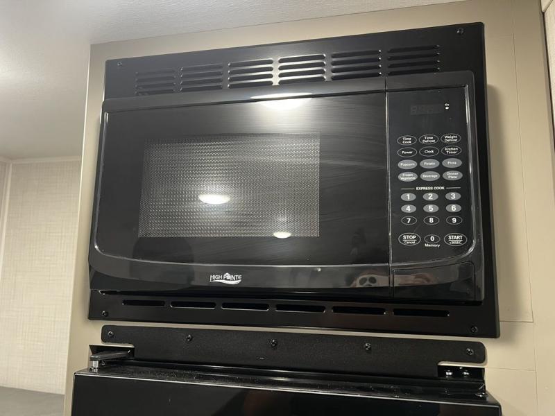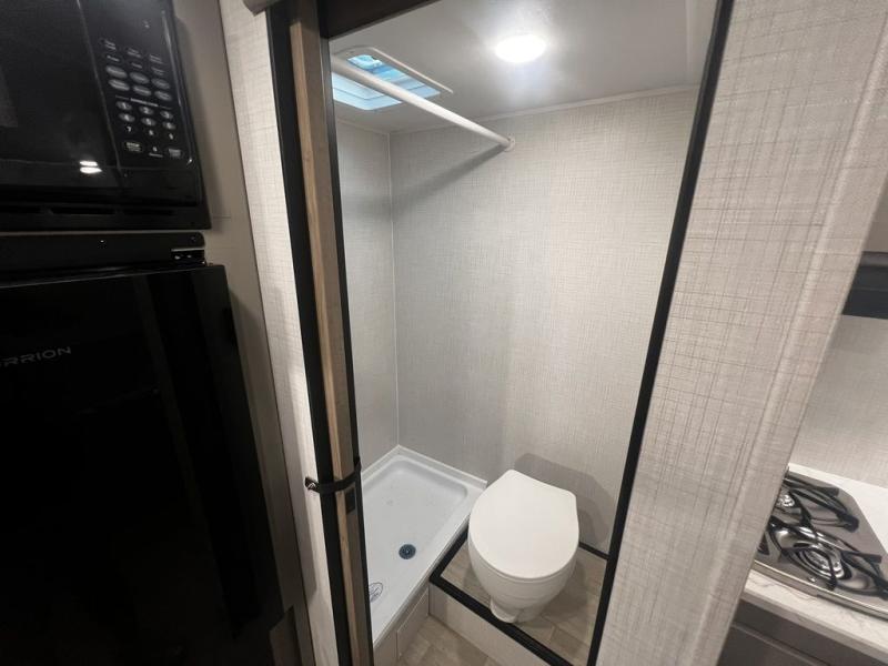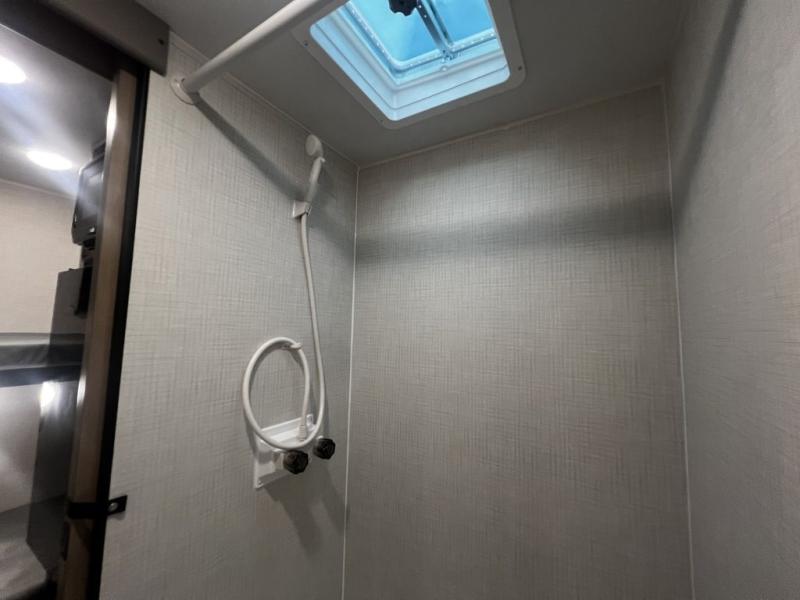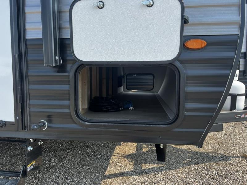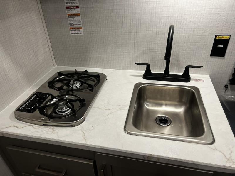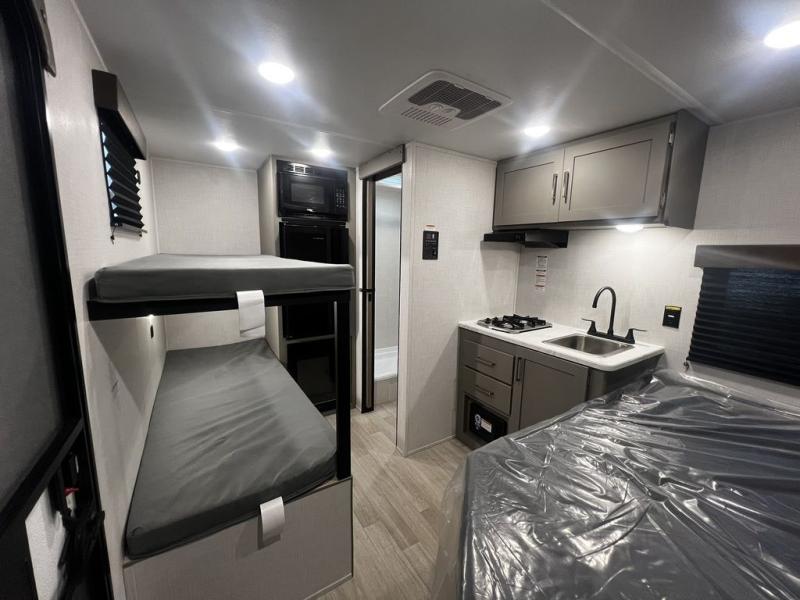 This lightweight travel trailer is perfect for four happy campers. You'll enjoy the front full-size bed, while your guests or little ones take the 28" x 74" bunk beds. There is also a shelf above the bed to keep your things organized. A private bath includes a shower with a toilet so you can freshen up each day without having to leave your camper. You can make your meals on the two burner gas cooktop or in the microwave oven, then take your plate outdoors to eat under the 8' power awning!