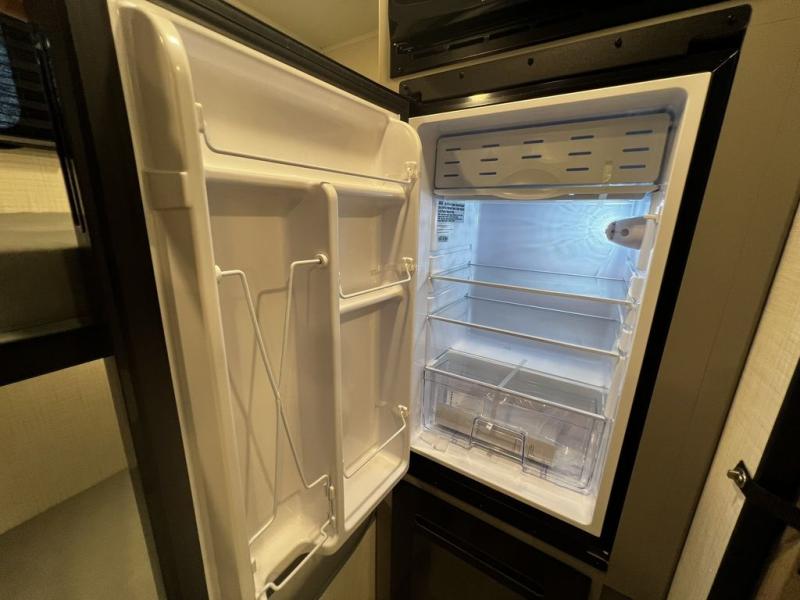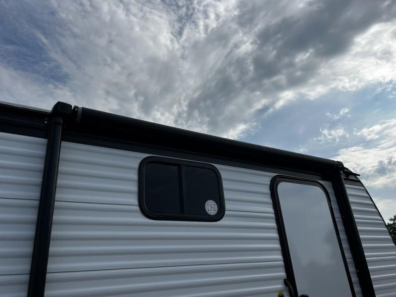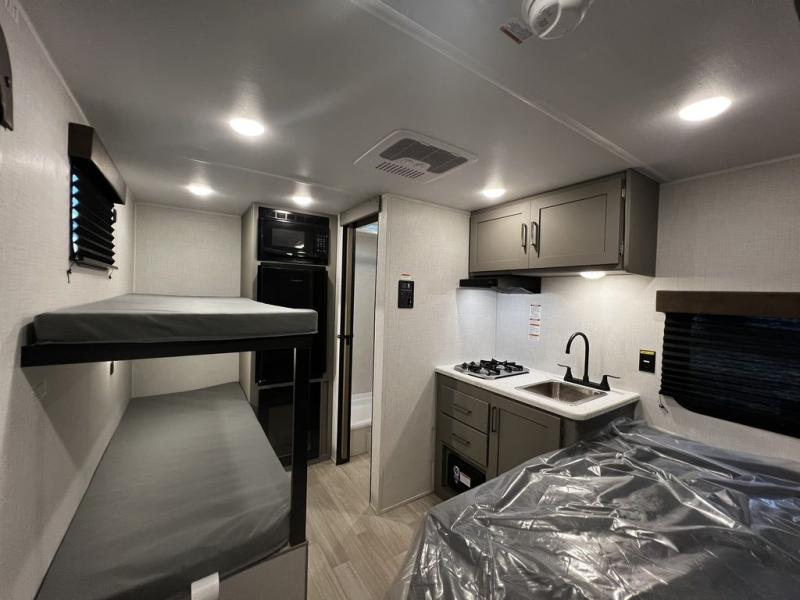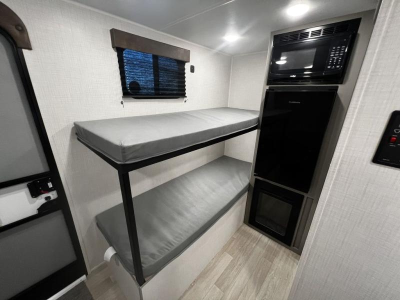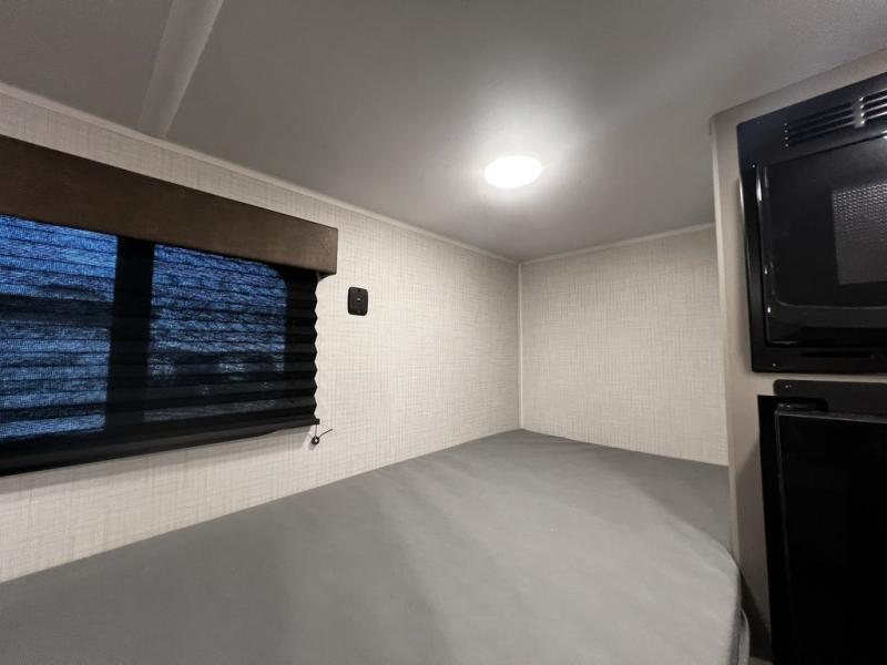 This lightweight travel trailer is perfect for four happy campers. You'll enjoy the front full-size bed, while your guests or little ones take the 28" x 74" bunk beds. There is also a shelf above the bed to keep your things organized. A private bath includes a shower with a toilet so you can freshen up each day without having to leave your camper. You can make your meals on the two burner gas cooktop or in the microwave oven, then take your plate outdoors to eat under the 8' power awning!