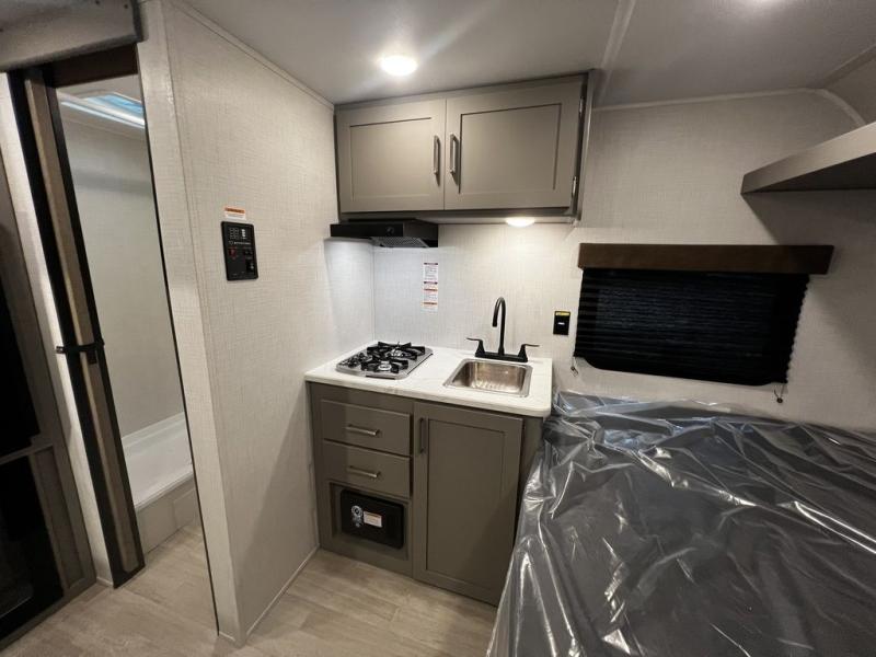With any Hideout Mini travel trailer by Keystone, you will enjoy lightweight towing thanks to their single-axle! The AlphaPly TPO roof membrane is ultra durable, and the power awning will provide protection from the sun as you relax in your camp chairs outside. Each model includes blackout night shades, LED lighting, plus many more interior comforts. There is also a roof A/C and 20K BTU furnace to keep you comfortable, plus a tankless water heater for endless hot showers!