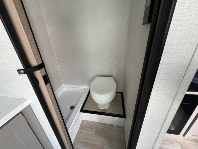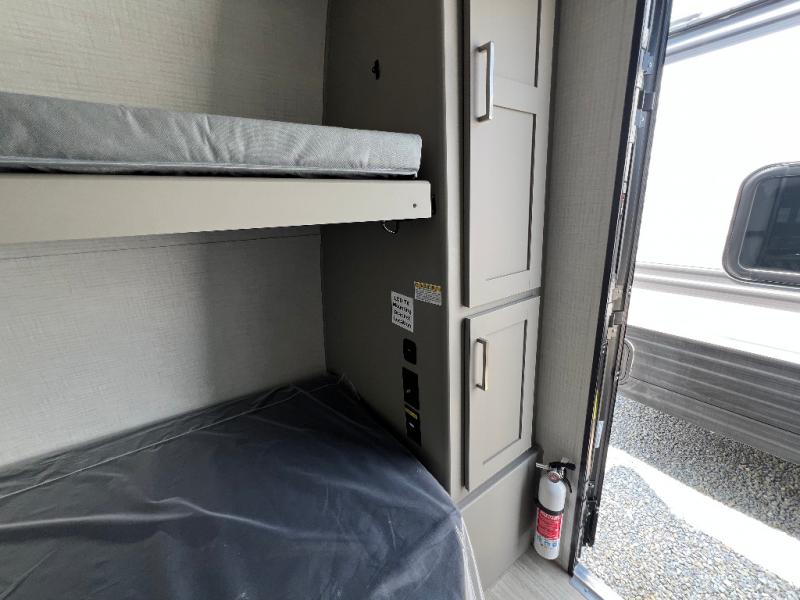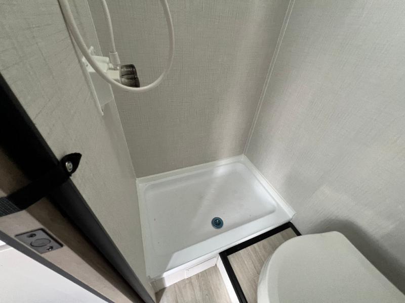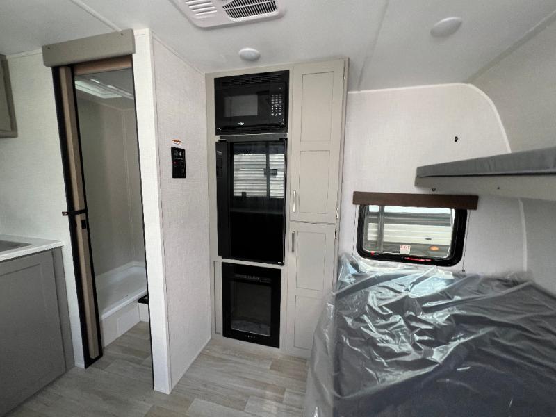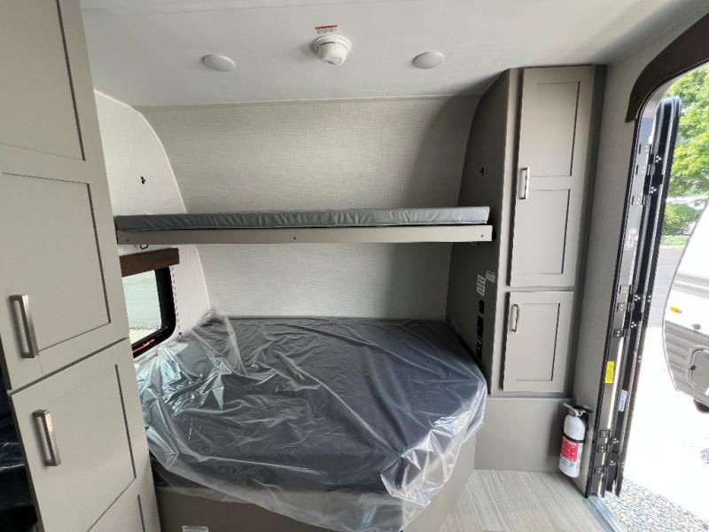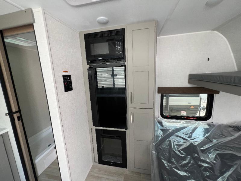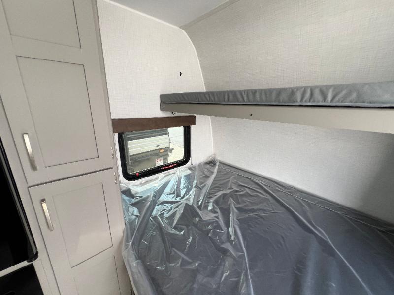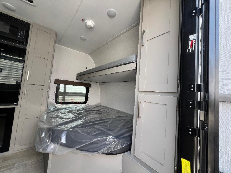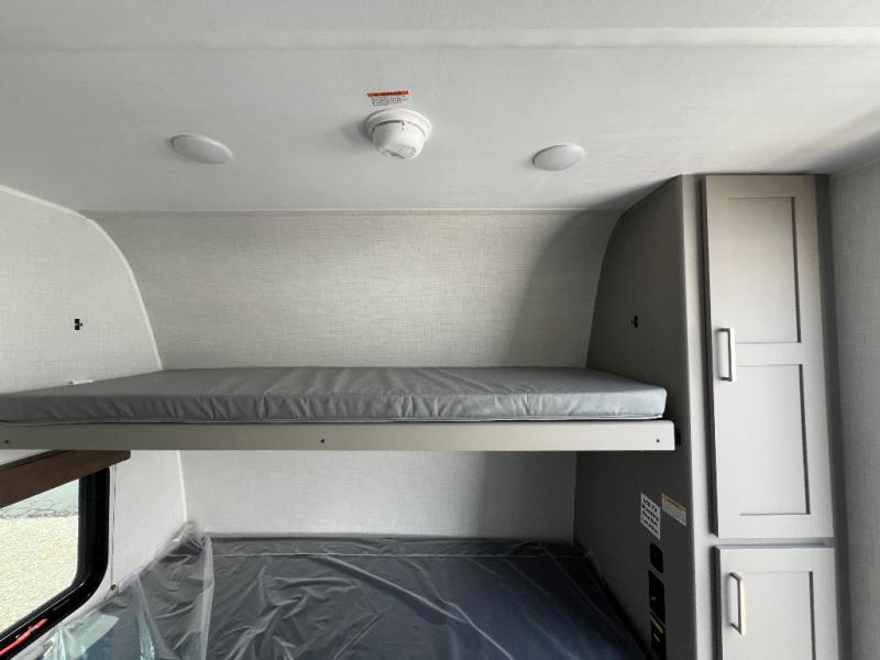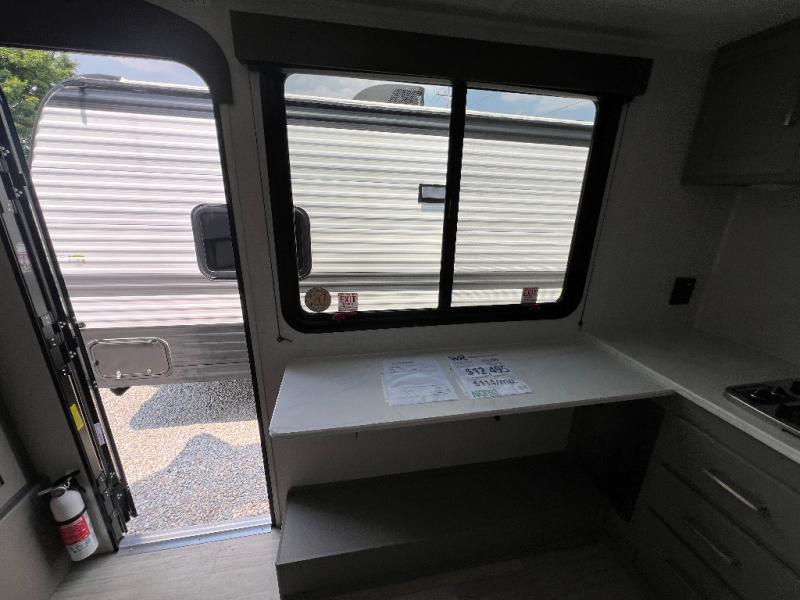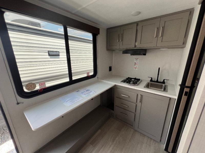 Your small crew will love camping in this lightweight travel trailer. There is a full-size bed up front with a folding bunk above plus a closet at the foot of the bed to keep your things out of the way. The two burner gas cooktop and microwave oven will let you make breakfast in the morning, and the folding table with two chairs provides a place to dine together. And a private bath with a shower and toilet lets you easily clean up after a day outdoors!
