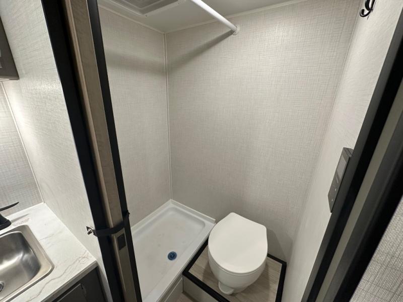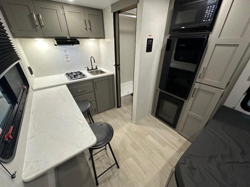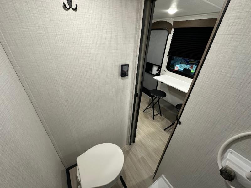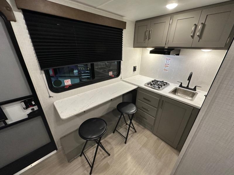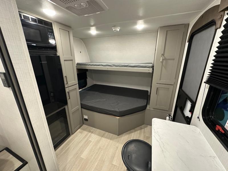 Your small crew will love camping in this lightweight travel trailer. There is a full-size bed up front with a folding bunk above plus a closet at the foot of the bed to keep your things out of the way. The two burner gas cooktop and microwave oven will let you make breakfast in the morning, and the folding table with two chairs provides a place to dine together. And a private bath with a shower and toilet lets you easily clean up after a day outdoors!