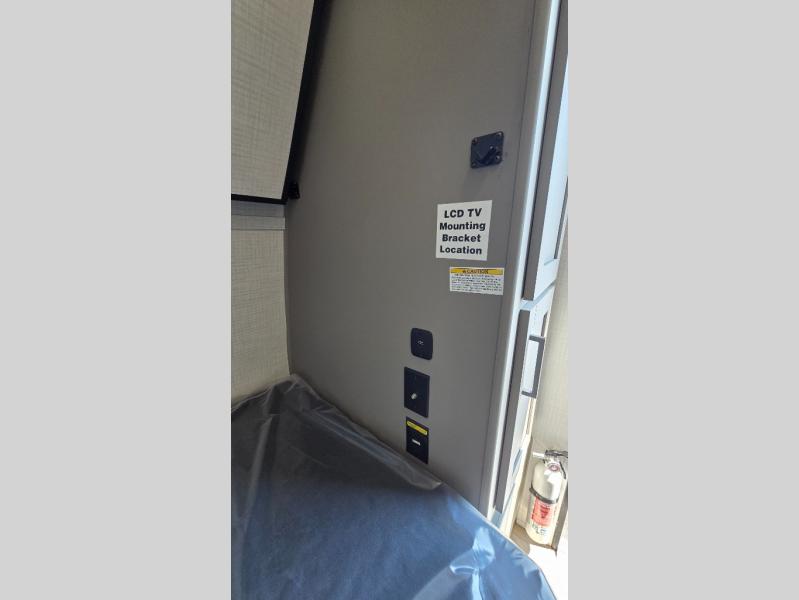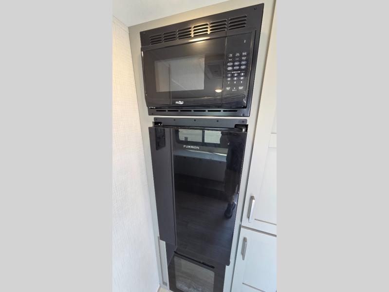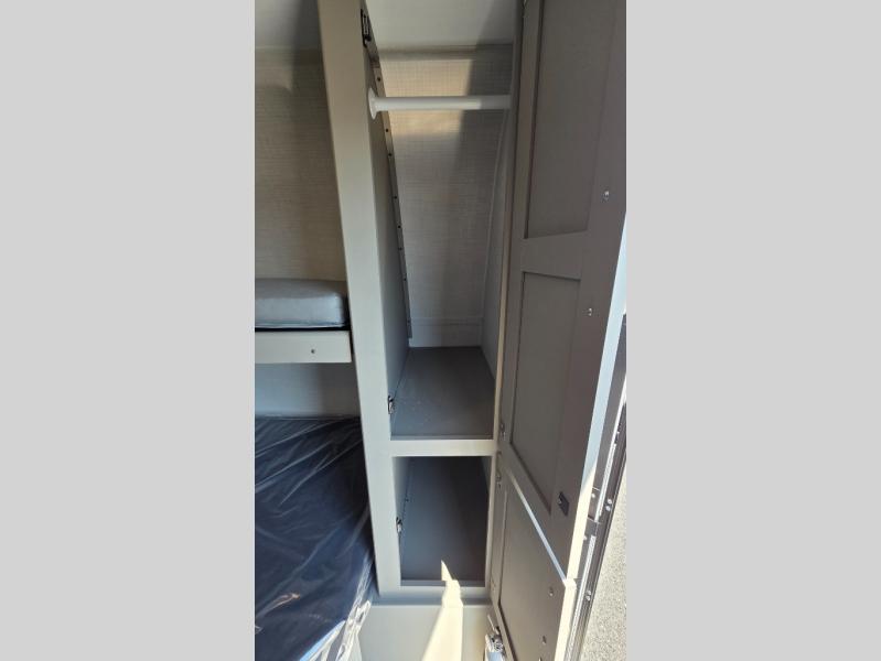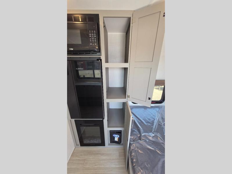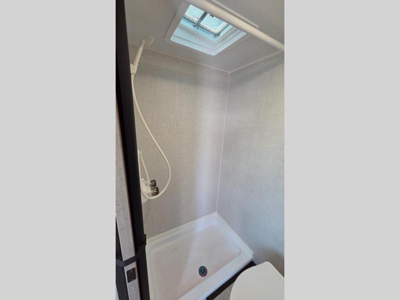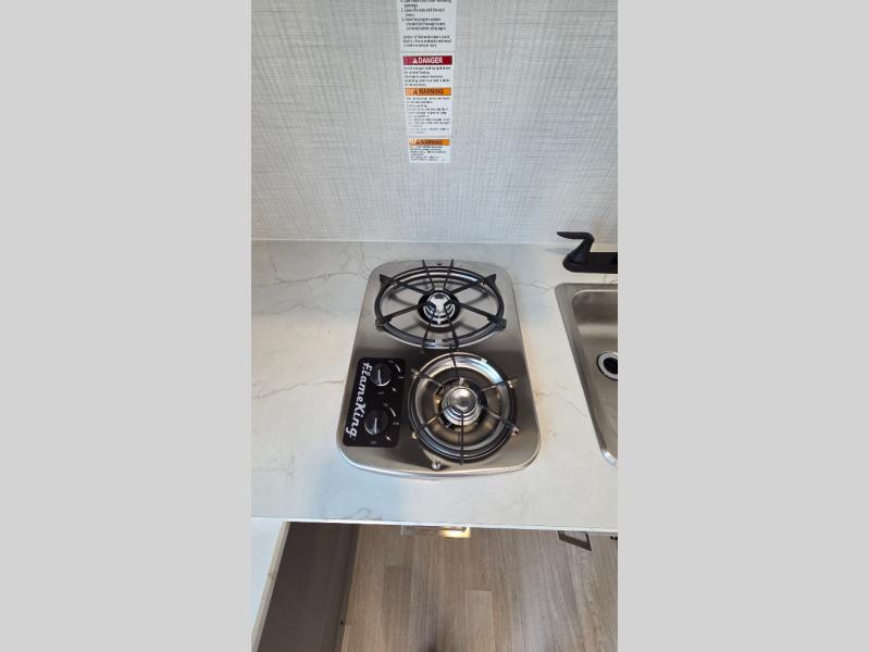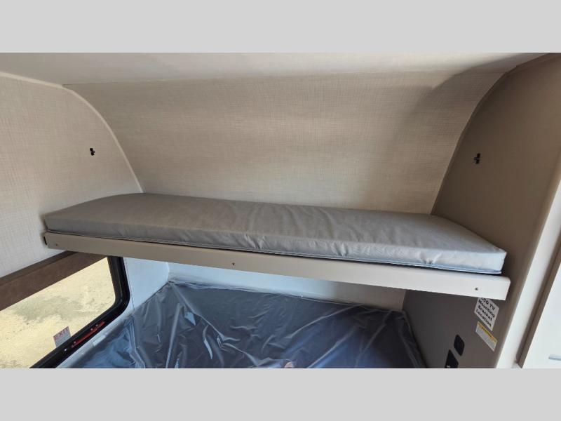 Your small crew will love camping in this lightweight travel trailer. There is a full-size bed up front with a folding bunk above plus a closet at the foot of the bed to keep your things out of the way. The two burner gas cooktop and microwave oven will let you make breakfast in the morning, and the folding table with two chairs provides a place to dine together. And a private bath with a shower and toilet lets you easily clean up after a day outdoors!