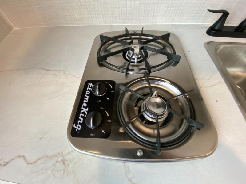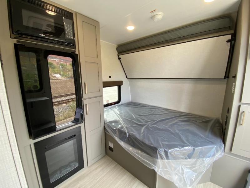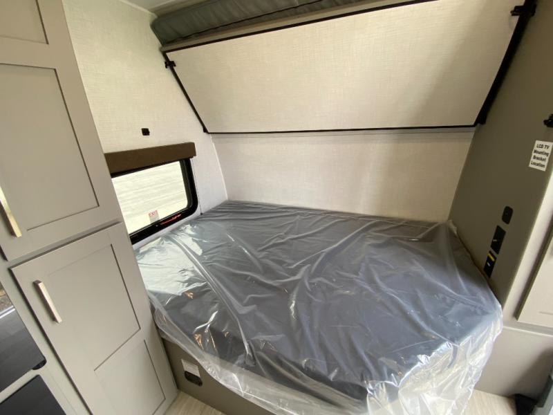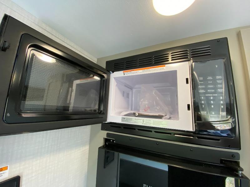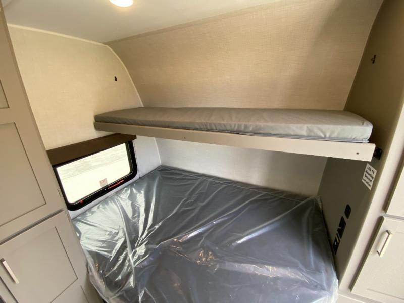 Your small crew will love camping in this lightweight travel trailer. There is a full-size bed up front with a folding bunk above plus a closet at the foot of the bed to keep your things out of the way. The two burner gas cooktop and microwave oven will let you make breakfast in the morning, and the folding table with two chairs provides a place to dine together. And a private bath with a shower and toilet lets you easily clean up after a day outdoors!