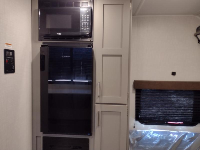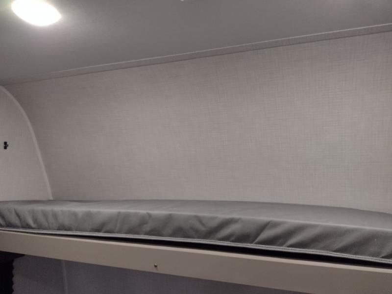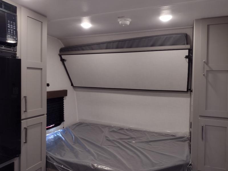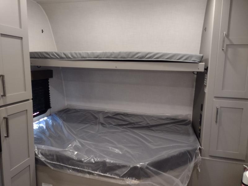 Your small crew will love camping in this lightweight travel trailer. There is a full-size bed up front with a folding bunk above plus a closet at the foot of the bed to keep your things out of the way. The two burner gas cooktop and microwave oven will let you make breakfast in the morning, and the folding table with two chairs provides a place to dine together. And a private bath with a shower and toilet lets you easily clean up after a day outdoors!