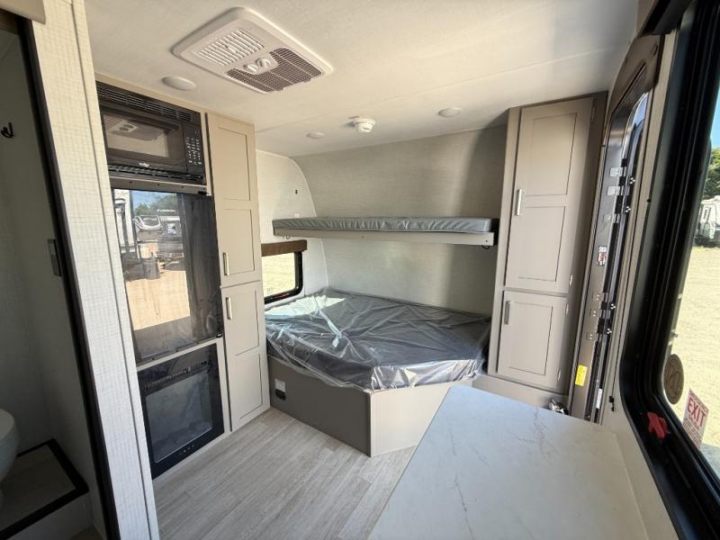 Your small crew will love camping in this lightweight travel trailer. There is a full-size bed up front with a folding bunk above plus a closet at the foot of the bed to keep your things out of the way. The two burner gas cooktop and microwave oven will let you make breakfast in the morning, and the folding table with two chairs provides a place to dine together. And a private bath with a shower and toilet lets you easily clean up after a day outdoors!