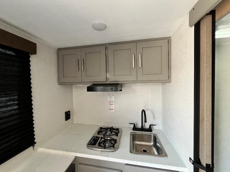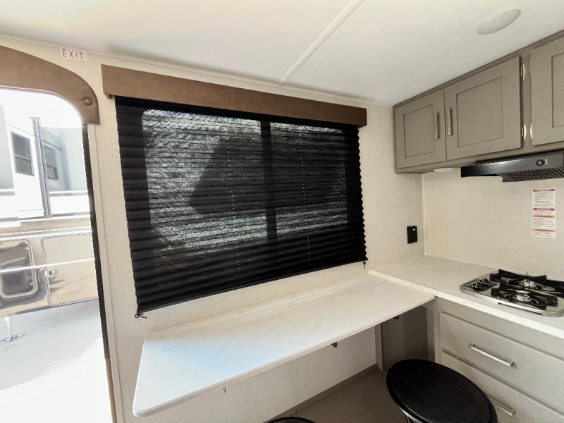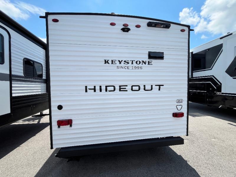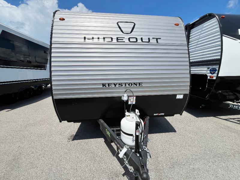 With any Hideout Mini travel trailer by Keystone, you will enjoy lightweight towing thanks to their single-axle! The AlphaPly TPO roof membrane is ultra durable, and the power awning will provide protection from the sun as you relax in your camp chairs outside. Each model includes blackout night shades, LED lighting, plus many more interior comforts. There is also a roof A/C and 20K BTU furnace to keep you comfortable, plus a tankless water heater for endless hot showers!