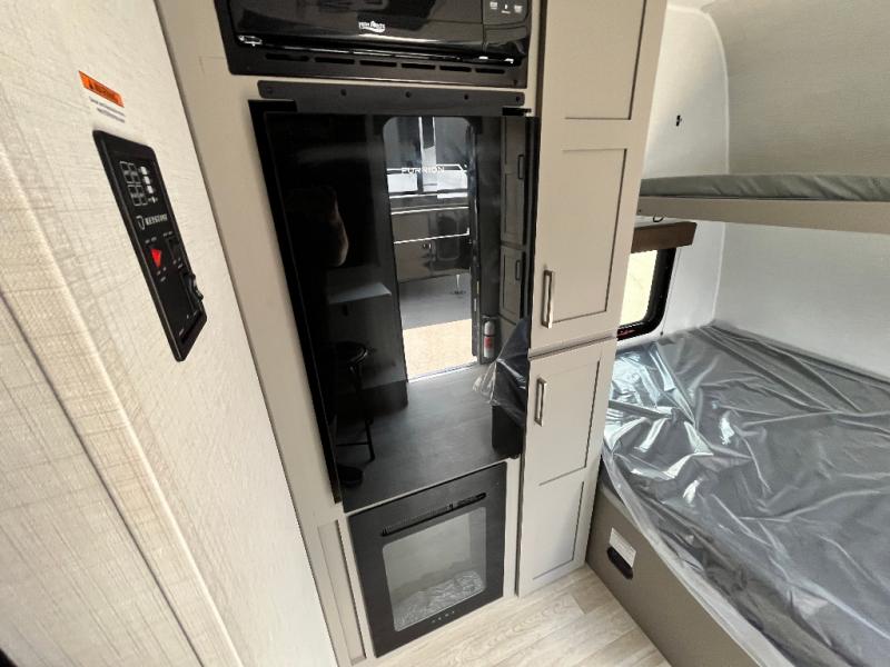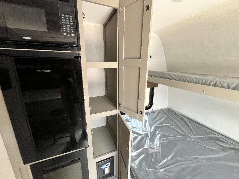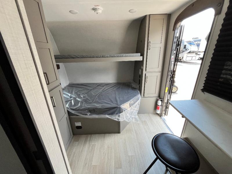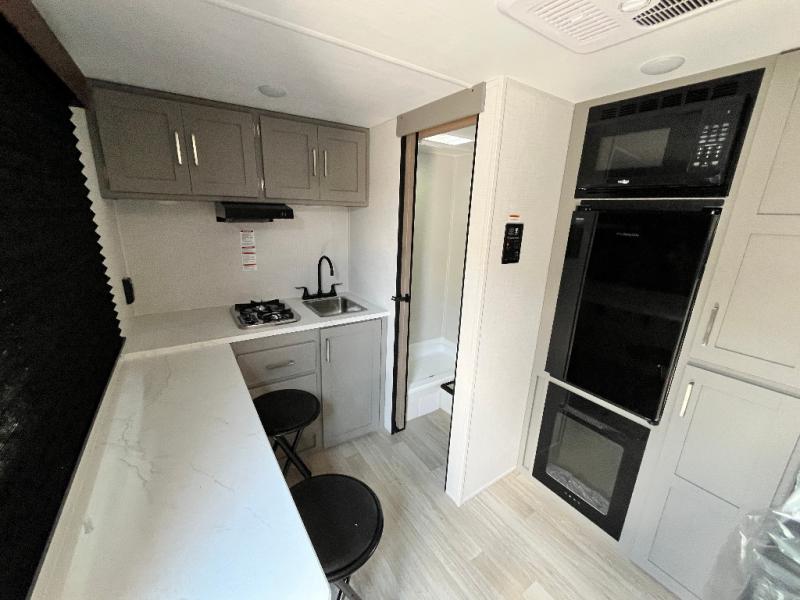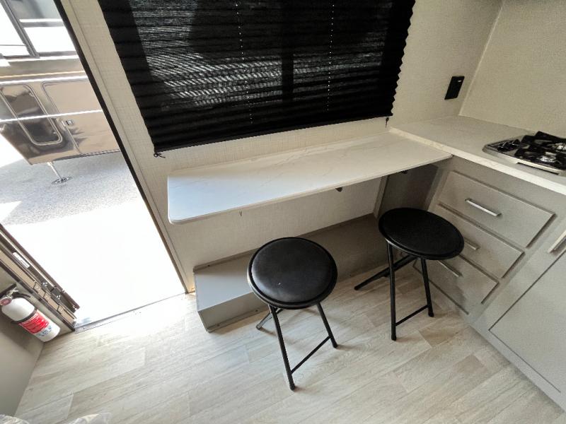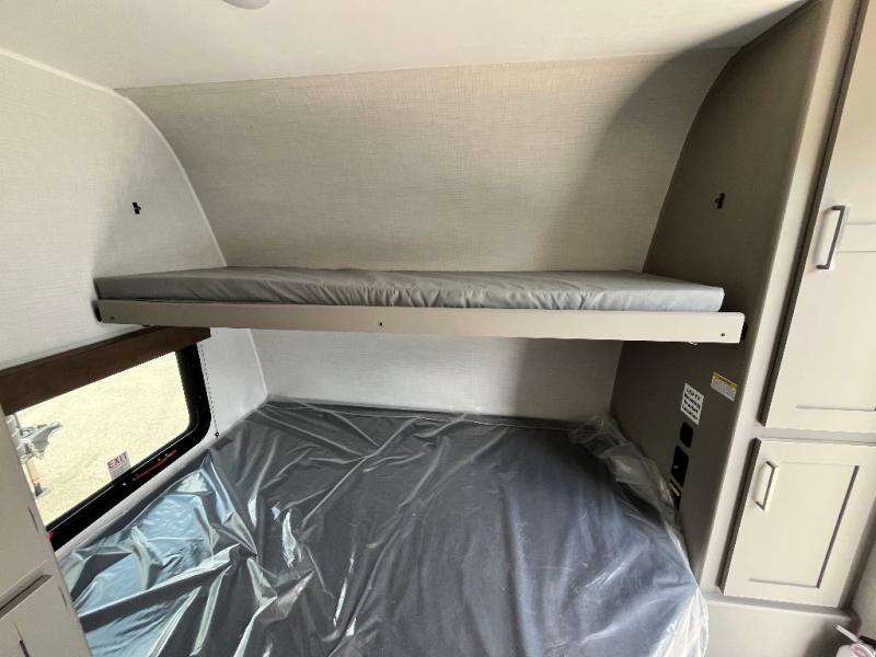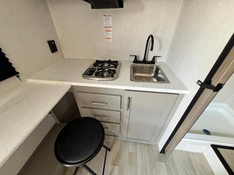 Your small crew will love camping in this lightweight travel trailer. There is a full-size bed up front with a folding bunk above plus a closet at the foot of the bed to keep your things out of the way. The two burner gas cooktop and microwave oven will let you make breakfast in the morning, and the folding table with two chairs provides a place to dine together. And a private bath with a shower and toilet lets you easily clean up after a day outdoors!