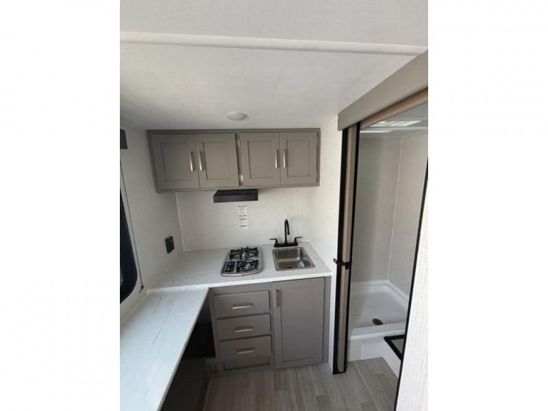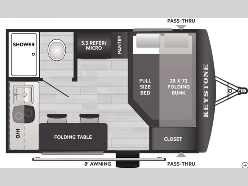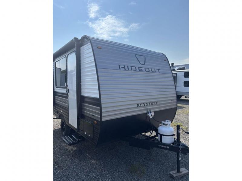 With any Hideout Mini travel trailer by Keystone, you will enjoy lightweight towing thanks to their single-axle! The AlphaPly TPO roof membrane is ultra durable, and the power awning will provide protection from the sun as you relax in your camp chairs outside. Each model includes blackout night shades, LED lighting, plus many more interior comforts. There is also a roof A/C and 20K BTU furnace to keep you comfortable, plus a tankless water heater for endless hot showers!