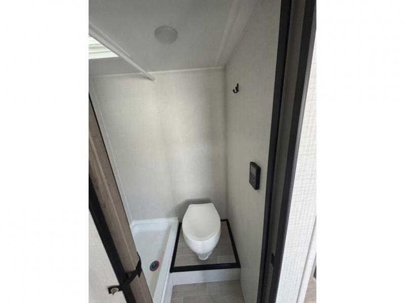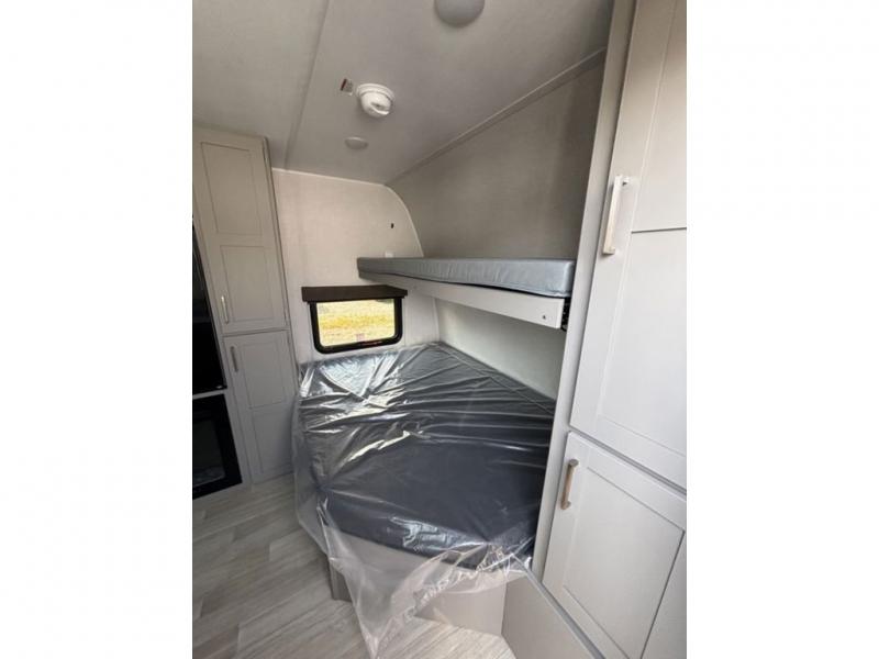 Your small crew will love camping in this lightweight travel trailer. There is a full-size bed up front with a folding bunk above plus a closet at the foot of the bed to keep your things out of the way. The two burner gas cooktop and microwave oven will let you make breakfast in the morning, and the folding table with two chairs provides a place to dine together. And a private bath with a shower and toilet lets you easily clean up after a day outdoors!