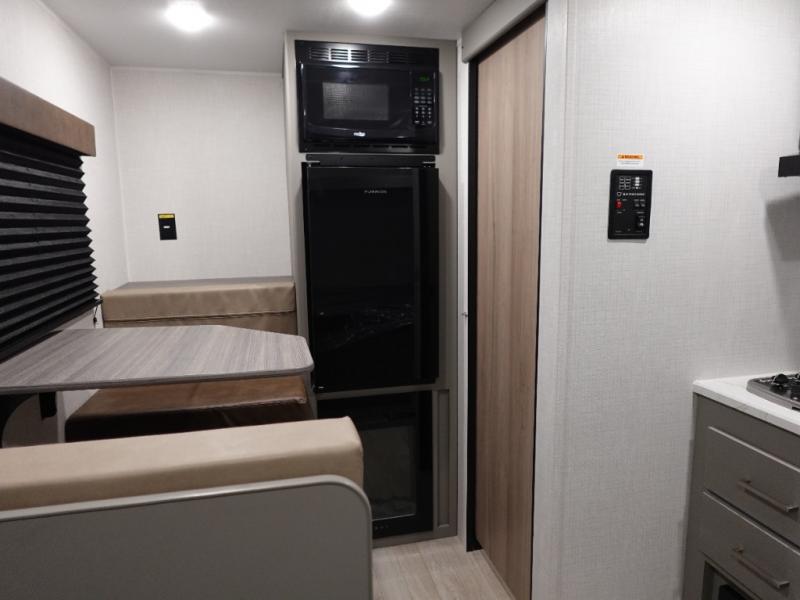 This lightweight travel trailer is perfect for three happy campers. You'll enjoy the front full-size bed, while your guest or little ones take the booth dinette when it's not being used to dine at. There is also a shelf above the bed to keep your things organized. A private bath includes a shower with a toilet so you can freshen up each day without having to leave your camper. You can make your meals on the two burner gas cooktop or in the microwave oven, then take your plate outdoors to eat under the 8' power awning!