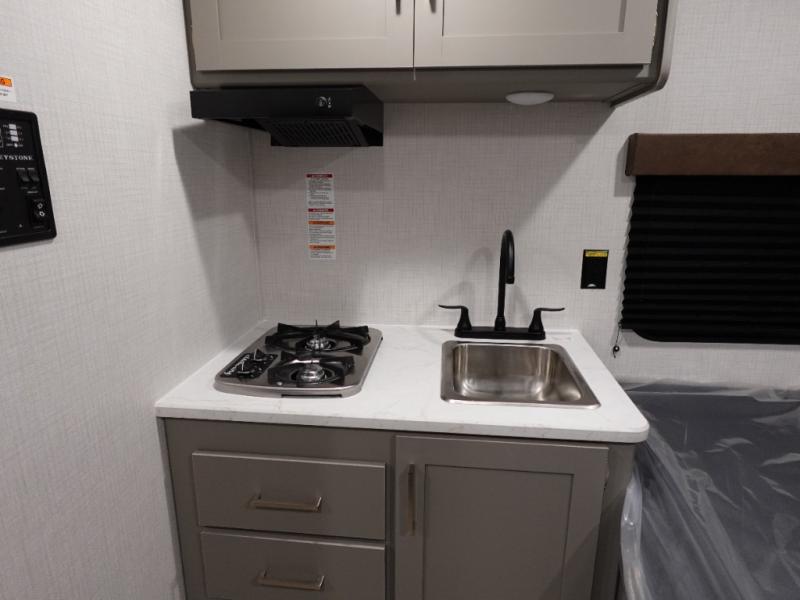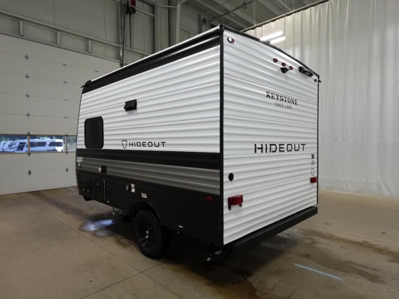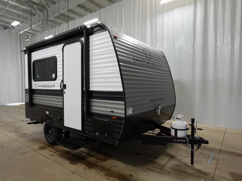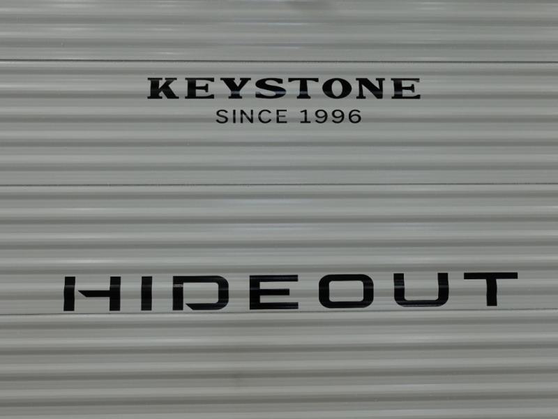 With any Hideout Mini travel trailer by Keystone, you will enjoy lightweight towing thanks to their single-axle! The AlphaPly TPO roof membrane is ultra durable, and the power awning will provide protection from the sun as you relax in your camp chairs outside. Each model includes blackout night shades, LED lighting, plus many more interior comforts. There is also a roof A/C and 20K BTU furnace to keep you comfortable, plus a tankless water heater for endless hot showers!