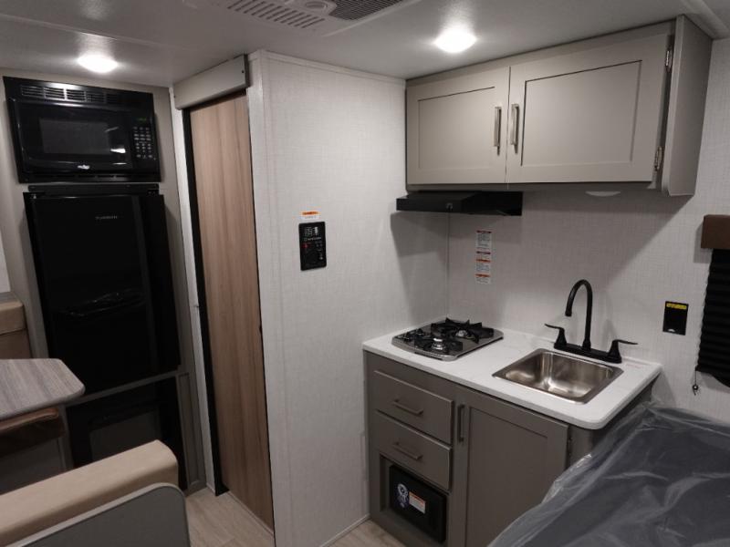 This lightweight travel trailer is perfect for three happy campers. You'll enjoy the front full-size bed, while your guest or little ones take the booth dinette when it's not being used to dine at. There is also a shelf above the bed to keep your things organized. A private bath includes a shower with a toilet so you can freshen up each day without having to leave your camper. You can make your meals on the two burner gas cooktop or in the microwave oven, then take your plate outdoors to eat under the 8' power awning!