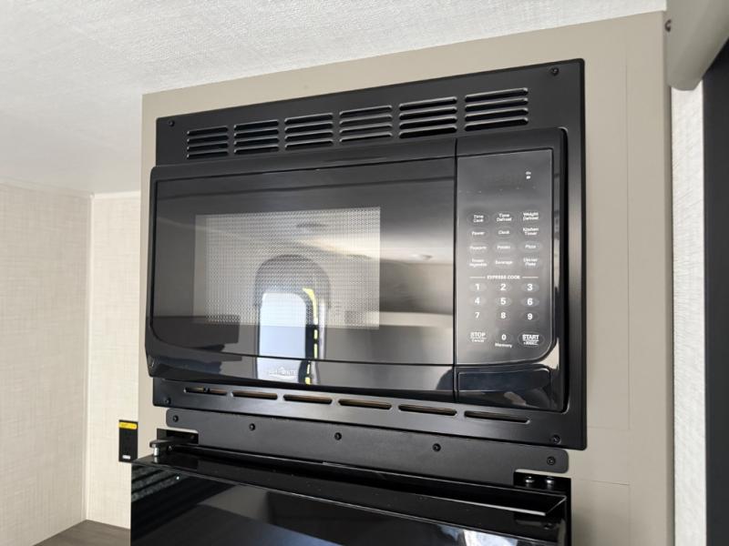 This lightweight travel trailer is perfect for three happy campers. You'll enjoy the front full-size bed, while your guest or little ones take the booth dinette when it's not being used to dine at. There is also a shelf above the bed to keep your things organized. A private bath includes a shower with a toilet so you can freshen up each day without having to leave your camper. You can make your meals on the two burner gas cooktop or in the microwave oven, then take your plate outdoors to eat under the 8' power awning!