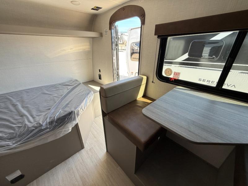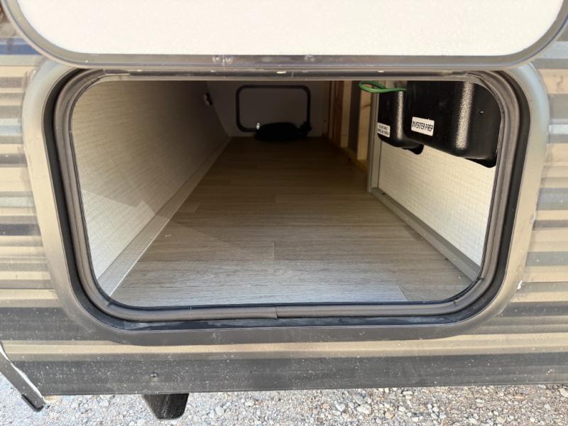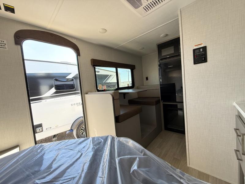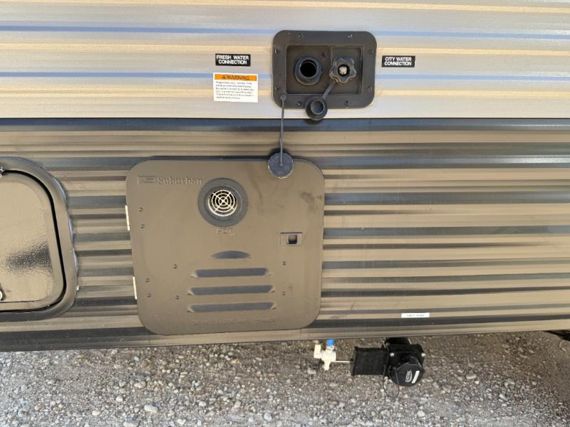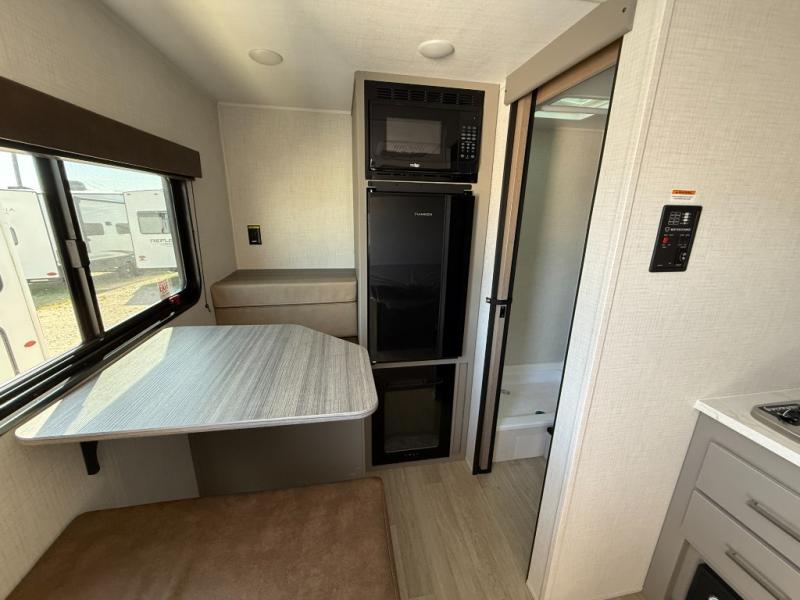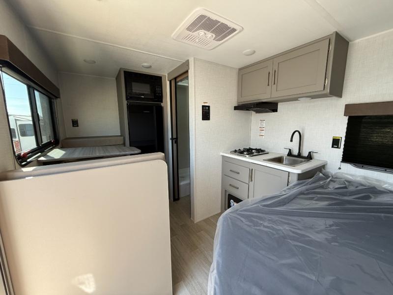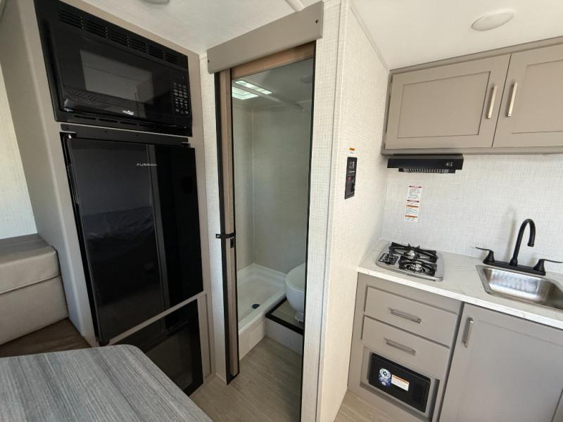 This lightweight travel trailer is perfect for three happy campers. You'll enjoy the front full-size bed, while your guest or little ones take the booth dinette when it's not being used to dine at. There is also a shelf above the bed to keep your things organized. A private bath includes a shower with a toilet so you can freshen up each day without having to leave your camper. You can make your meals on the two burner gas cooktop or in the microwave oven, then take your plate outdoors to eat under the 8' power awning!