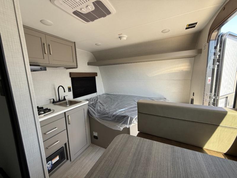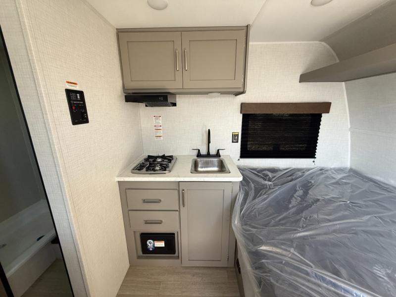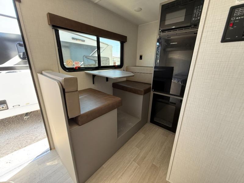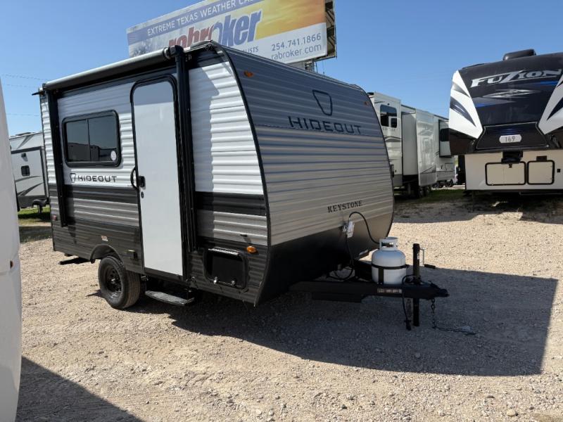 With any Hideout Mini travel trailer by Keystone, you will enjoy lightweight towing thanks to their single-axle! The AlphaPly TPO roof membrane is ultra durable, and the power awning will provide protection from the sun as you relax in your camp chairs outside. Each model includes blackout night shades, LED lighting, plus many more interior comforts. There is also a roof A/C and 20K BTU furnace to keep you comfortable, plus a tankless water heater for endless hot showers!