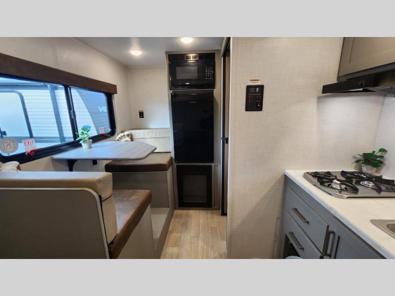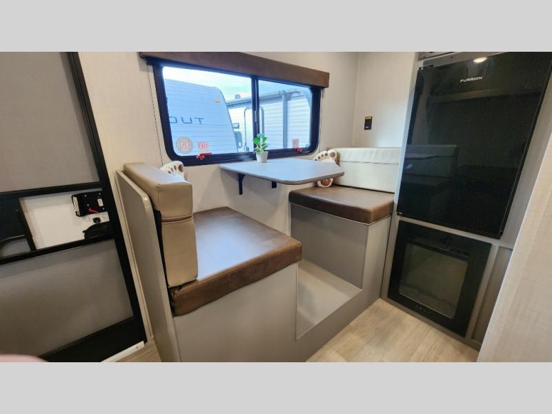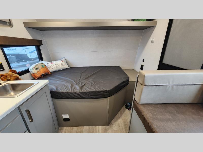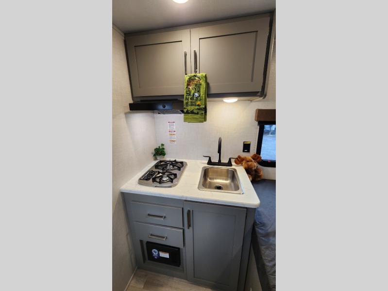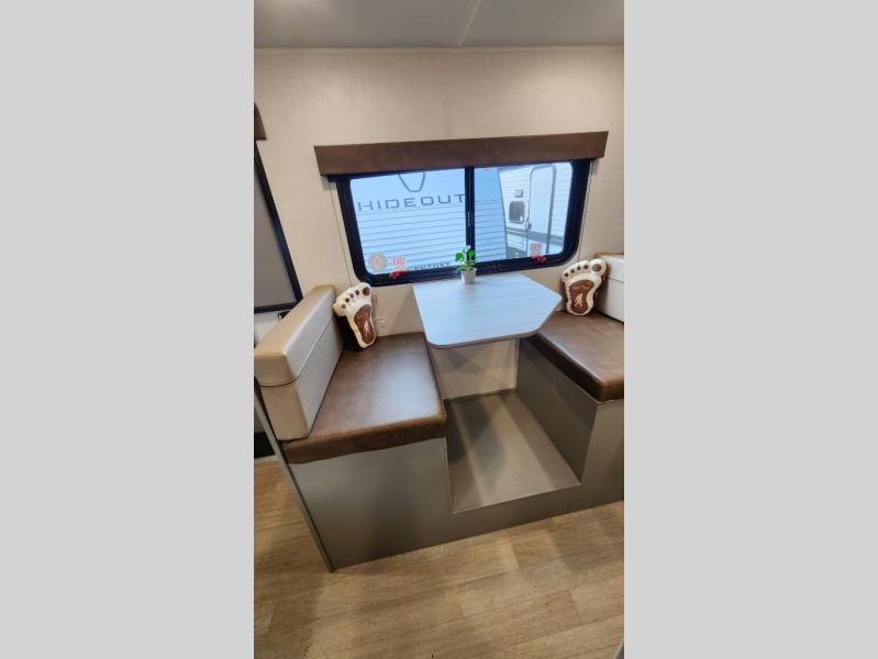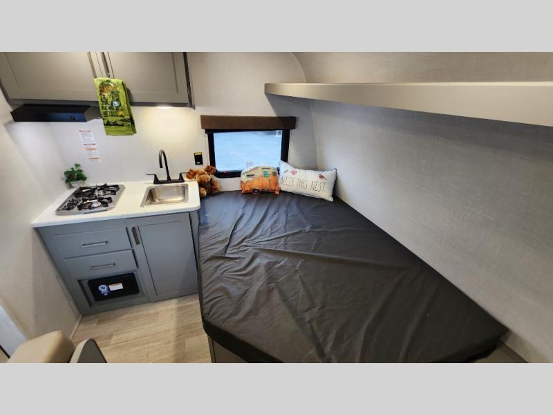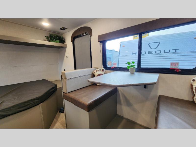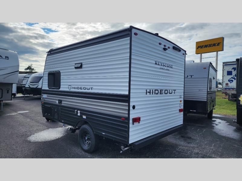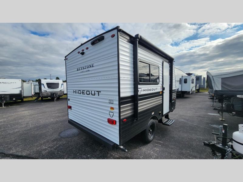 With any Hideout Mini travel trailer by Keystone, you will enjoy lightweight towing thanks to their single-axle! The AlphaPly TPO roof membrane is ultra durable, and the power awning will provide protection from the sun as you relax in your camp chairs outside. Each model includes blackout night shades, LED lighting, plus many more interior comforts. There is also a roof A/C and 20K BTU furnace to keep you comfortable, plus a tankless water heater for endless hot showers!