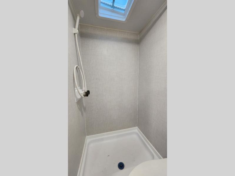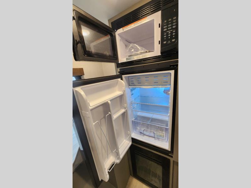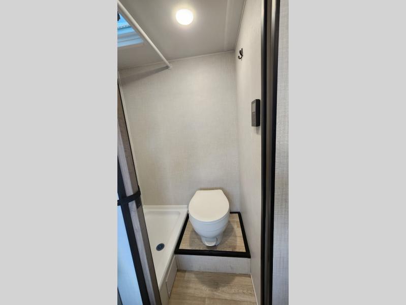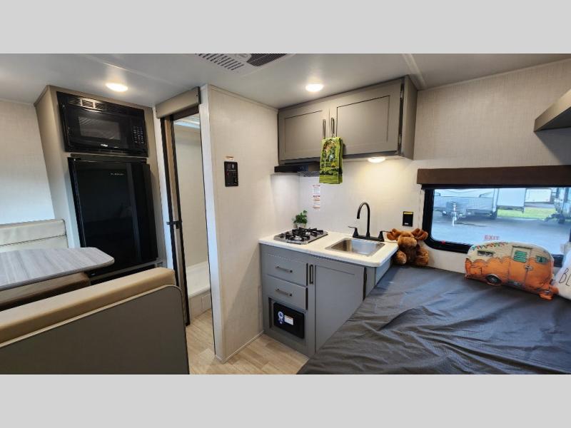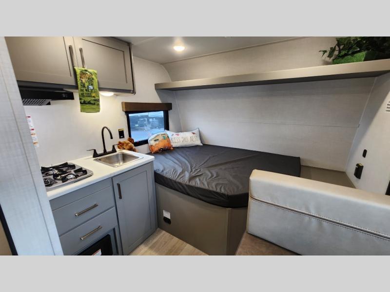 This lightweight travel trailer is perfect for three happy campers. You'll enjoy the front full-size bed, while your guest or little ones take the booth dinette when it's not being used to dine at. There is also a shelf above the bed to keep your things organized. A private bath includes a shower with a toilet so you can freshen up each day without having to leave your camper. You can make your meals on the two burner gas cooktop or in the microwave oven, then take your plate outdoors to eat under the 8' power awning!