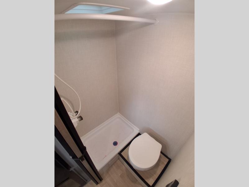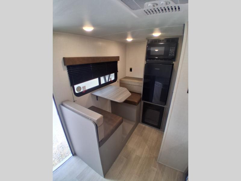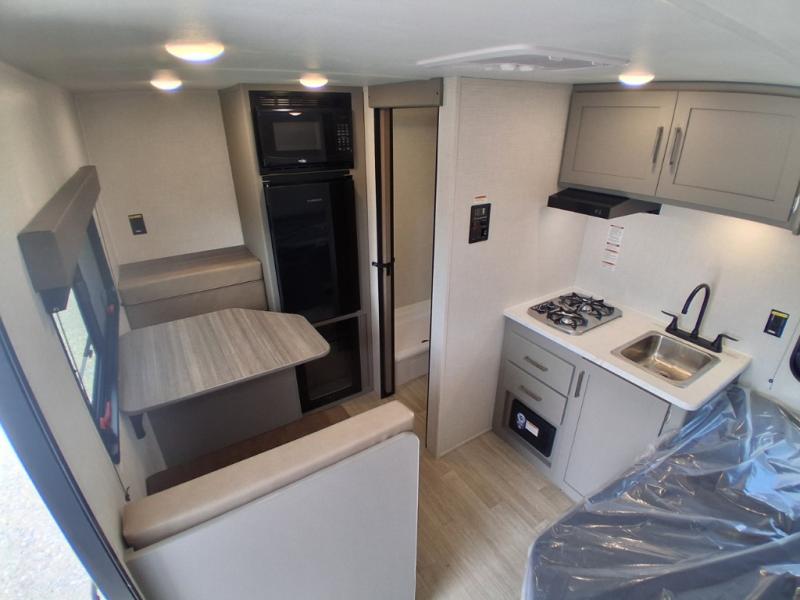 This lightweight travel trailer is perfect for three happy campers. You'll enjoy the front full-size bed, while your guest or little ones take the booth dinette when it's not being used to dine at. There is also a shelf above the bed to keep your things organized. A private bath includes a shower with a toilet so you can freshen up each day without having to leave your camper. You can make your meals on the two burner gas cooktop or in the microwave oven, then take your plate outdoors to eat under the 8' power awning!