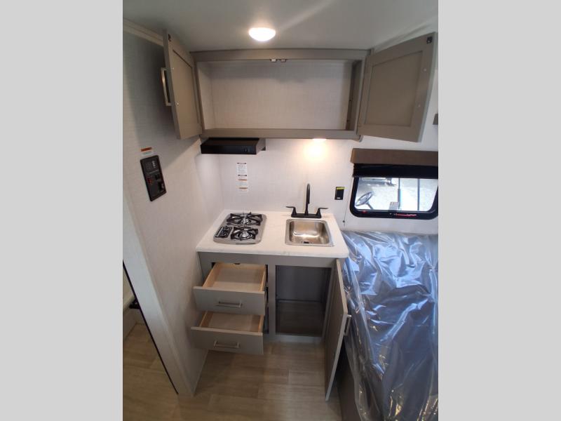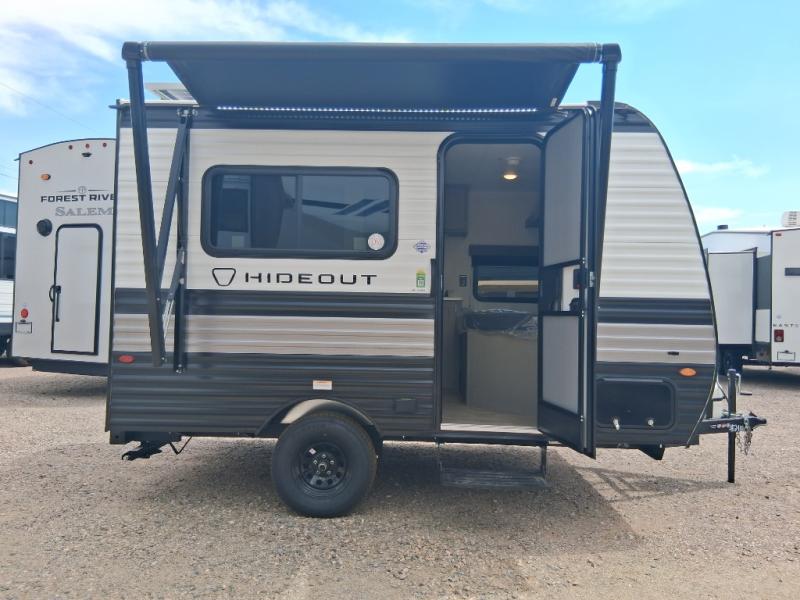 With any Hideout Mini travel trailer by Keystone, you will enjoy lightweight towing thanks to their single-axle! The AlphaPly TPO roof membrane is ultra durable, and the power awning will provide protection from the sun as you relax in your camp chairs outside. Each model includes blackout night shades, LED lighting, plus many more interior comforts. There is also a roof A/C and 20K BTU furnace to keep you comfortable, plus a tankless water heater for endless hot showers!