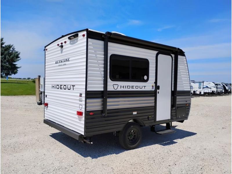 With any Hideout Mini travel trailer by Keystone, you will enjoy lightweight towing thanks to their single-axle! The AlphaPly TPO roof membrane is ultra durable, and the power awning will provide protection from the sun as you relax in your camp chairs outside. Each model includes blackout night shades, LED lighting, plus many more interior comforts. There is also a roof A/C and 20K BTU furnace to keep you comfortable, plus a tankless water heater for endless hot showers!