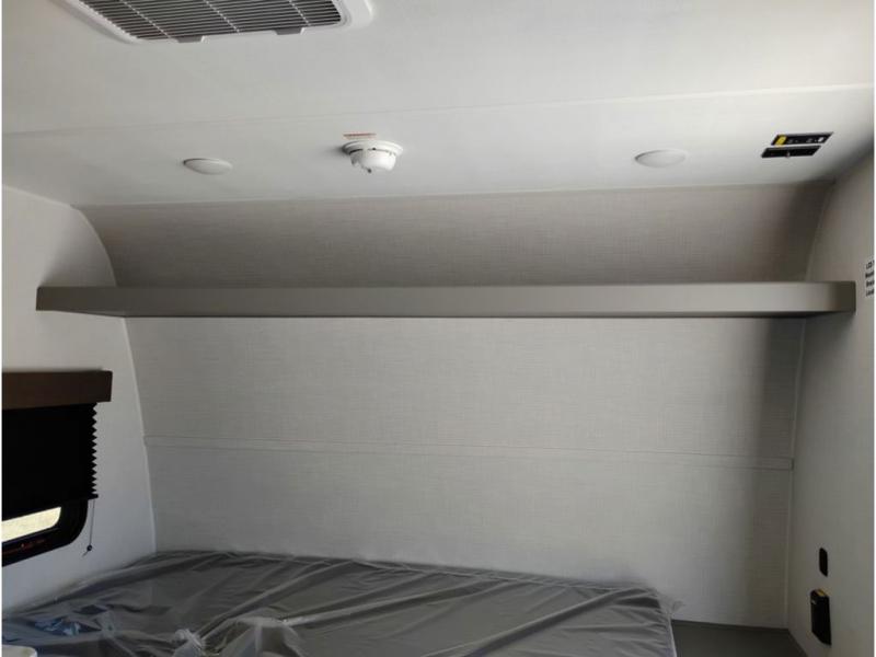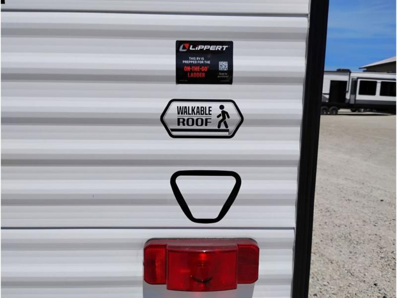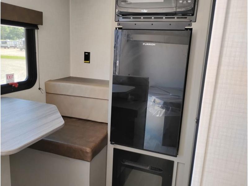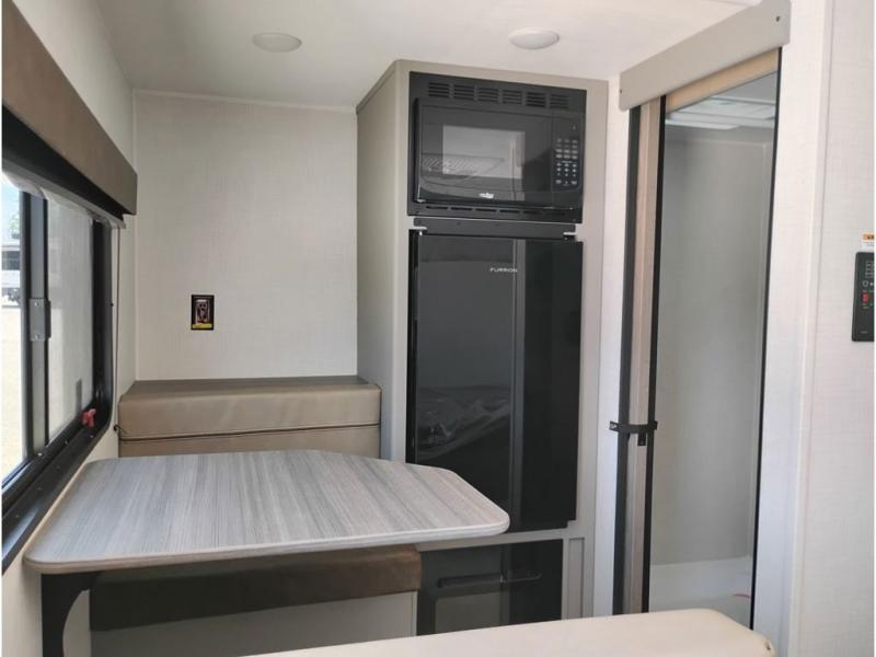 This lightweight travel trailer is perfect for three happy campers. You'll enjoy the front full-size bed, while your guest or little ones take the booth dinette when it's not being used to dine at. There is also a shelf above the bed to keep your things organized. A private bath includes a shower with a toilet so you can freshen up each day without having to leave your camper. You can make your meals on the two burner gas cooktop or in the microwave oven, then take your plate outdoors to eat under the 8' power awning!